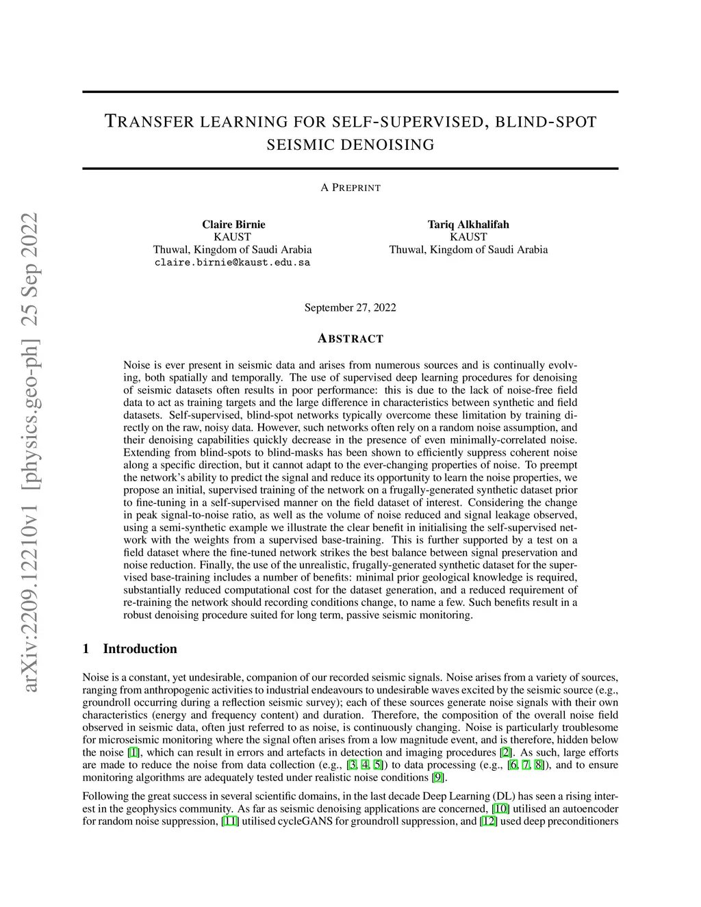 Transfer learning for self-supervised, blind-spot seismic denoising