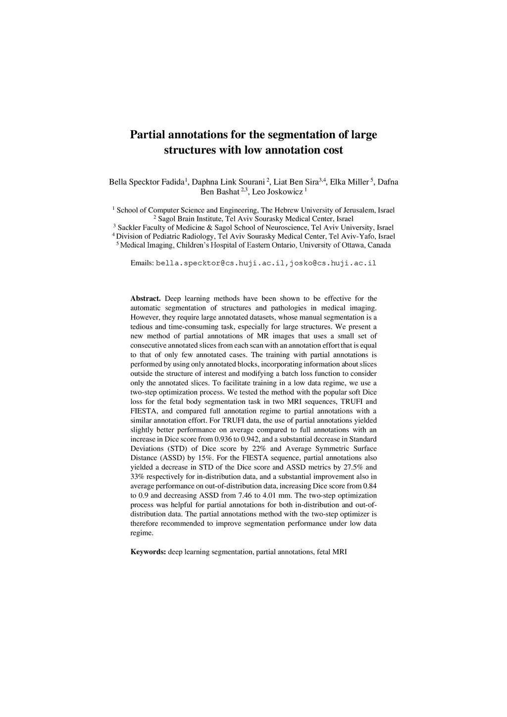 Deep learning methods have been shown to be effective for the automatic segmentation of structures and pathologies in medical imaging. However, they require large annotated datasets, whose manual segmentation is a tedious and time-consuming task, especially for large structures. We present a new method of partial annotations that uses a small set of consecutive annotated slices from each scan with an annotation effort that is equal to that of only few annotated cases. The training with partial annotations is performed by using only annotated blocks, incorporating information about slices outside the structure of interest and modifying a batch loss function to consider only the annotated slices. To facilitate training in a low data regime, we use a two-step optimization process. We tested the method with the popular soft Dice loss for the fetal body segmentation task in two MRI sequences, TRUFI and FIESTA, and compared full annotation regime to partial annotations with a similar annotation effort. For TRUFI data, the use of partial annotations yielded slightly better performance on average compared to full annotations with an increase in Dice score from 0.936 to 0.942, and a substantial decrease in Standard Deviations (STD) of Dice score by 22% and Average Symmetric Surface Distance (ASSD) by 15%. For the FIESTA sequence, partial annotations also yielded a decrease in STD of the Dice score and ASSD metrics by 27.5% and 33% respectively for in-distribution data, and a substantial improvement also in average performance on out-of-distribution data, increasing Dice score from 0.84 to 0.9 and decreasing ASSD from 7.46 to 4.01 mm. The two-step optimization process was helpful for partial annotations for both in-distribution and out-of-distribution data. The partial annotations method with the two-step optimizer is therefore recommended to improve segmentation performance under low data regime.