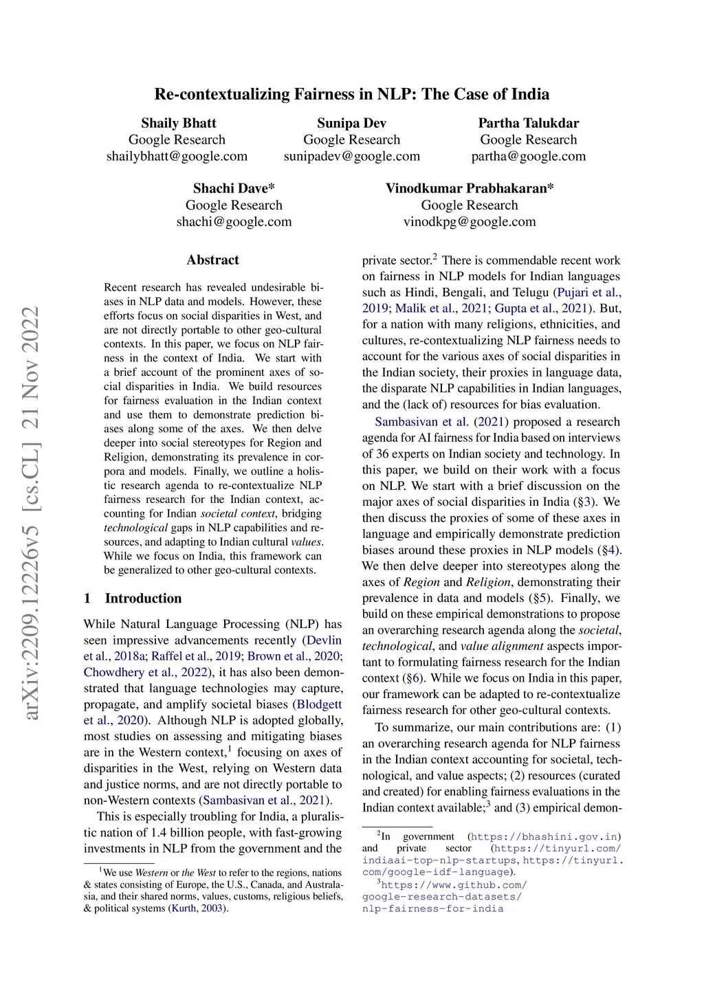 Recent research has revealed undesirable biases in NLP data and models. However, these efforts focus on social disparities in West, and are not directly portable to other geo-cultural contexts. In this paper, we focus on NLP fair-ness in the context of India. We start with a brief account of the prominent axes of social disparities in India. We build resources for fairness evaluation in the Indian context and use them to demonstrate prediction biases along some of the axes. We then delve deeper into social stereotypes for Region andReligion, demonstrating its prevalence in corpora and models. Finally, we outline a holistic research agenda to re-contextualize NLP fairness research for the Indian context, ac-counting for Indian societal context, bridging technological gaps in NLP capabilities and re-sources, and adapting to Indian cultural values. While we focus on India, this framework can be generalized to other geo-cultural contexts.
