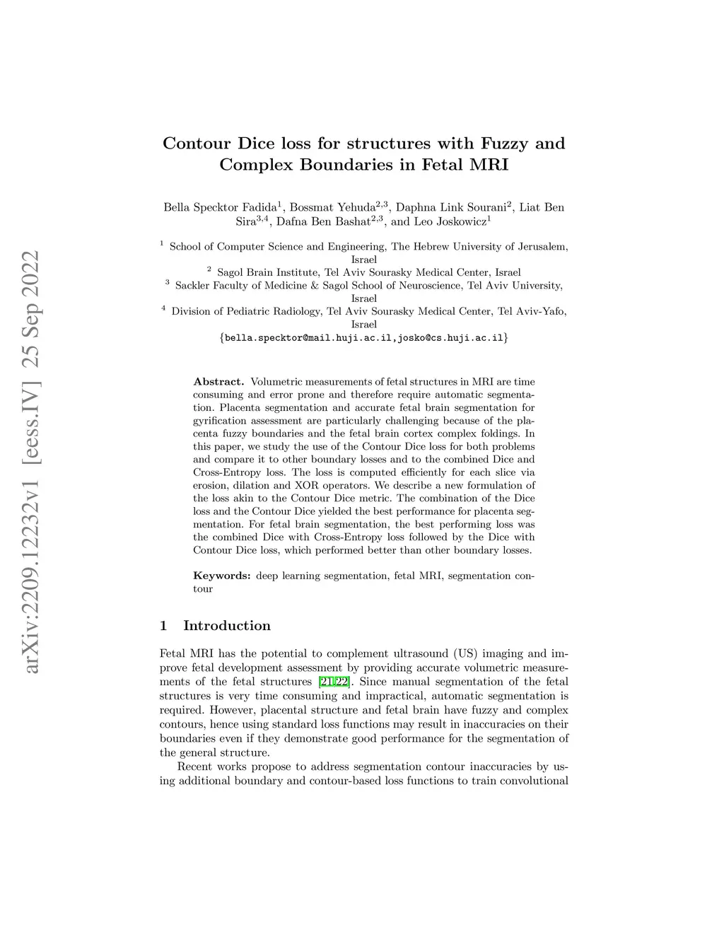 Volumetric measurements of fetal structures in MRI are time consuming and error prone and therefore require automatic segmentation. Placenta segmentation and accurate fetal brain segmentation for gyrification assessment are particularly challenging because of the placenta fuzzy boundaries and the fetal brain cortex complex foldings. In this paper, we study the use of the Contour Dice loss for both problems and compare it to other boundary losses and to the combined Dice and Cross-Entropy loss. The loss is computed efficiently for each slice via erosion, dilation and XOR operators. We describe a new formulation of the loss akin to the Contour Dice metric. The combination of the Dice loss and the Contour Dice yielded the best performance for placenta segmentation. For fetal brain segmentation, the best performing loss was the combined Dice with Cross-Entropy loss followed by the Dice with Contour Dice loss, which performed better than other boundary losses.