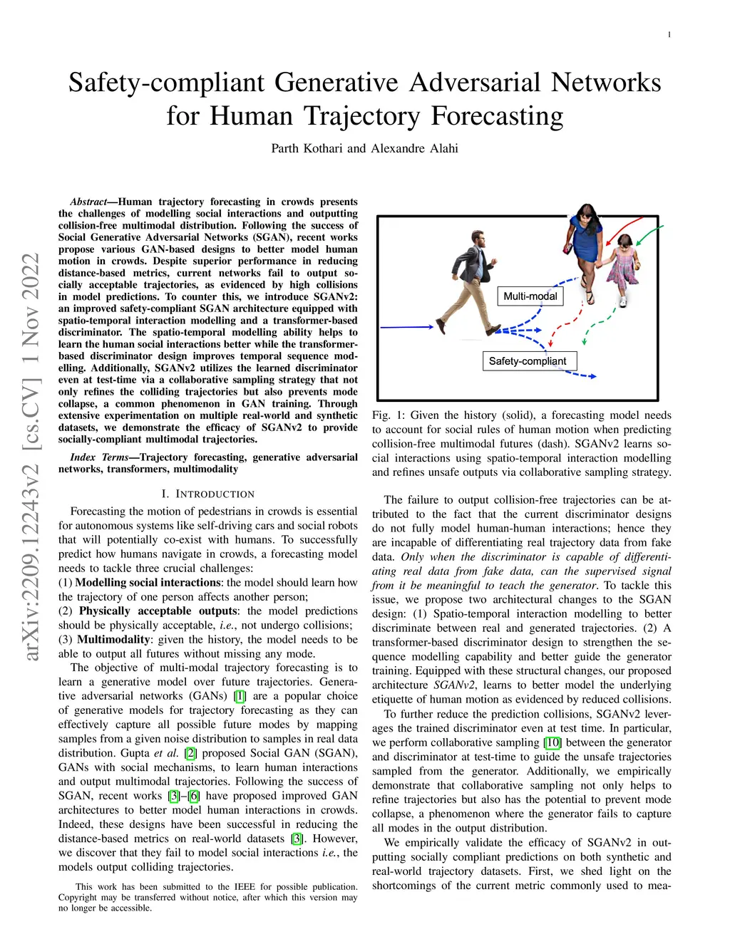Human trajectory forecasting in crowds presents the challenges of modelling social interactions and outputting collision-free multimodal distribution. Following the success of Social Generative Adversarial Networks (SGAN), recent works propose various GAN-based designs to better model human motion in crowds. Despite superior performance in reducing distance-based metrics, current networks fail to output socially acceptable trajectories, as evidenced by high collisions in model predictions. To counter this, we introduce SGANv2: an improved safety-compliant SGAN architecture equipped with spatio-temporal interaction modelling and a transformer-based discriminator. The spatio-temporal modelling ability helps to learn the human social interactions better while the transformer-based discriminator design improves temporal sequence modelling. Additionally, SGANv2 utilizes the learned discriminator even at test-time via a collaborative sampling strategy that not only refines the colliding trajectories but also prevents mode collapse, a common phenomenon in GAN training. Through extensive experimentation on multiple real-world and synthetic datasets, we demonstrate the efficacy of SGANv2 to provide socially-compliant multimodal trajectories.