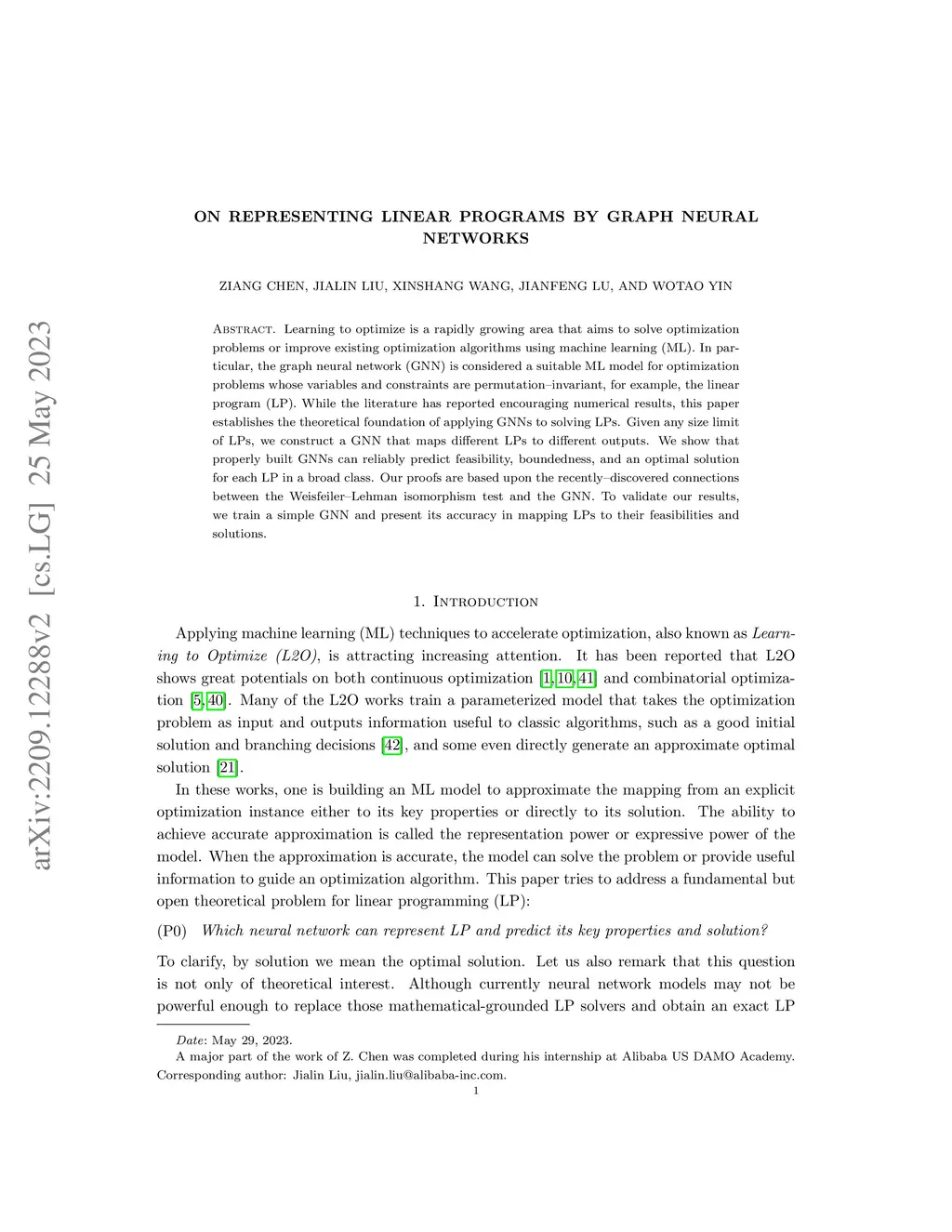 Learning to optimize is a rapidly growing area that aims to solve optimization problems or improve existing optimization algorithms using machine learning (ML). In particular, the graph neural network (GNN) is considered a suitable ML model for optimization problems whose variables and constraints are permutation--invariant, for example, the linear program (LP). While the literature has reported encouraging numerical results, this paper establishes the theoretical foundation of applying GNNs to solving LPs. Given any size limit of LPs, we construct a GNN that maps different LPs to different outputs. We show that properly built GNNs can reliably predict feasibility, boundedness, and an optimal solution for each LP in a broad class. Our proofs are based upon the recently--discovered connections between the Weisfeiler--Lehman isomorphism test and the GNN. To validate our results, we train a simple GNN and present its accuracy in mapping LPs to their feasibilities and solutions.
