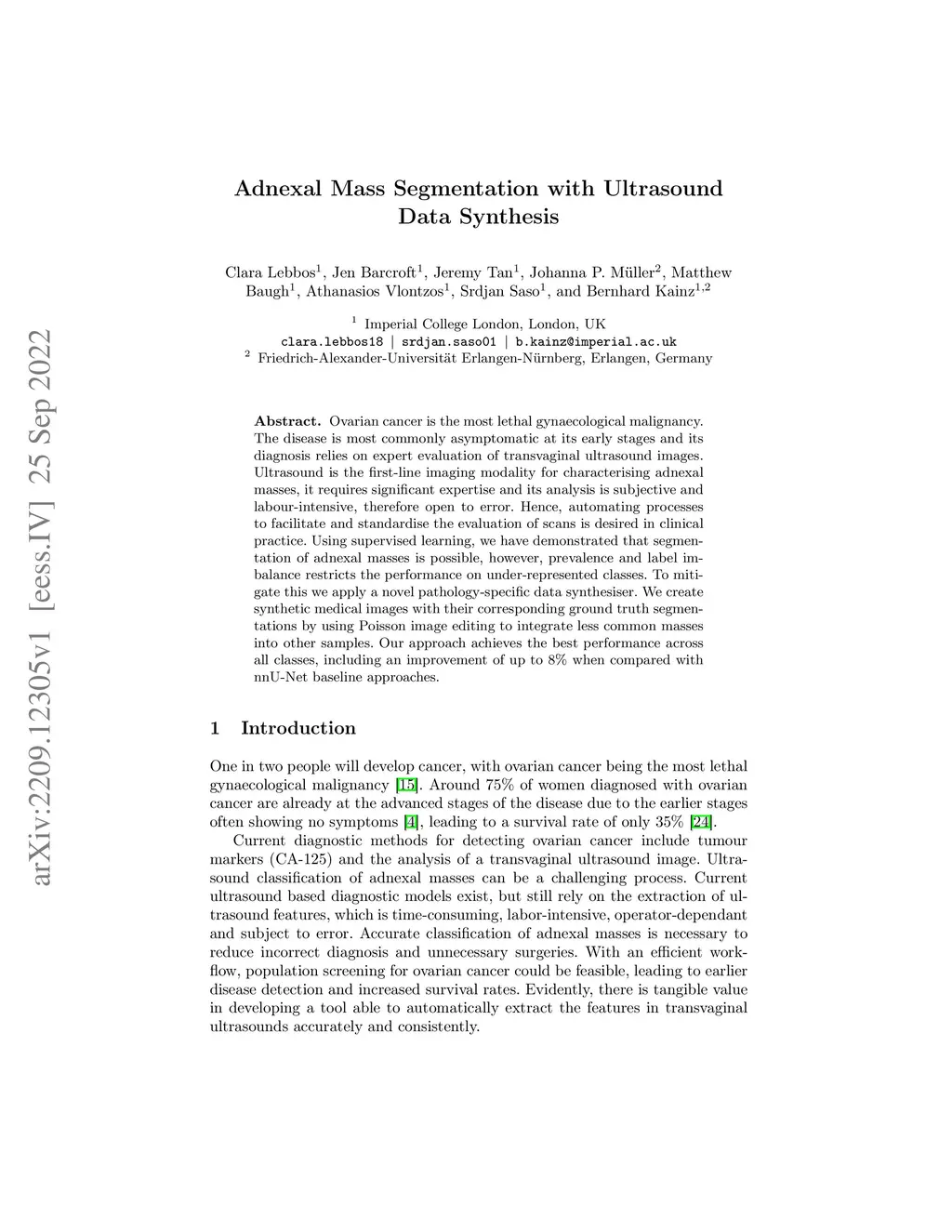 Ovarian cancer is the most lethal gynaecological malignancy. The disease is most commonly asymptomatic at its early stages and its diagnosis relies on expert evaluation of transvaginal ultrasound images. Ultrasound is the first-line imaging modality for characterising adnexal masses, it requires significant expertise and its analysis is subjective and labour-intensive, therefore open to error. Hence, automating processes to facilitate and standardise the evaluation of scans is desired in clinical practice. Using supervised learning, we have demonstrated that segmentation of adnexal masses is possible, however, prevalence and label imbalance restricts the performance on under-represented classes. To mitigate this we apply a novel pathology-specific data synthesiser. We create synthetic medical images with their corresponding ground truth segmentations by using Poisson image editing to integrate less common masses into other samples. Our approach achieves the best performance across all classes, including an improvement of up to 8% when compared with nnU-Net baseline approaches.