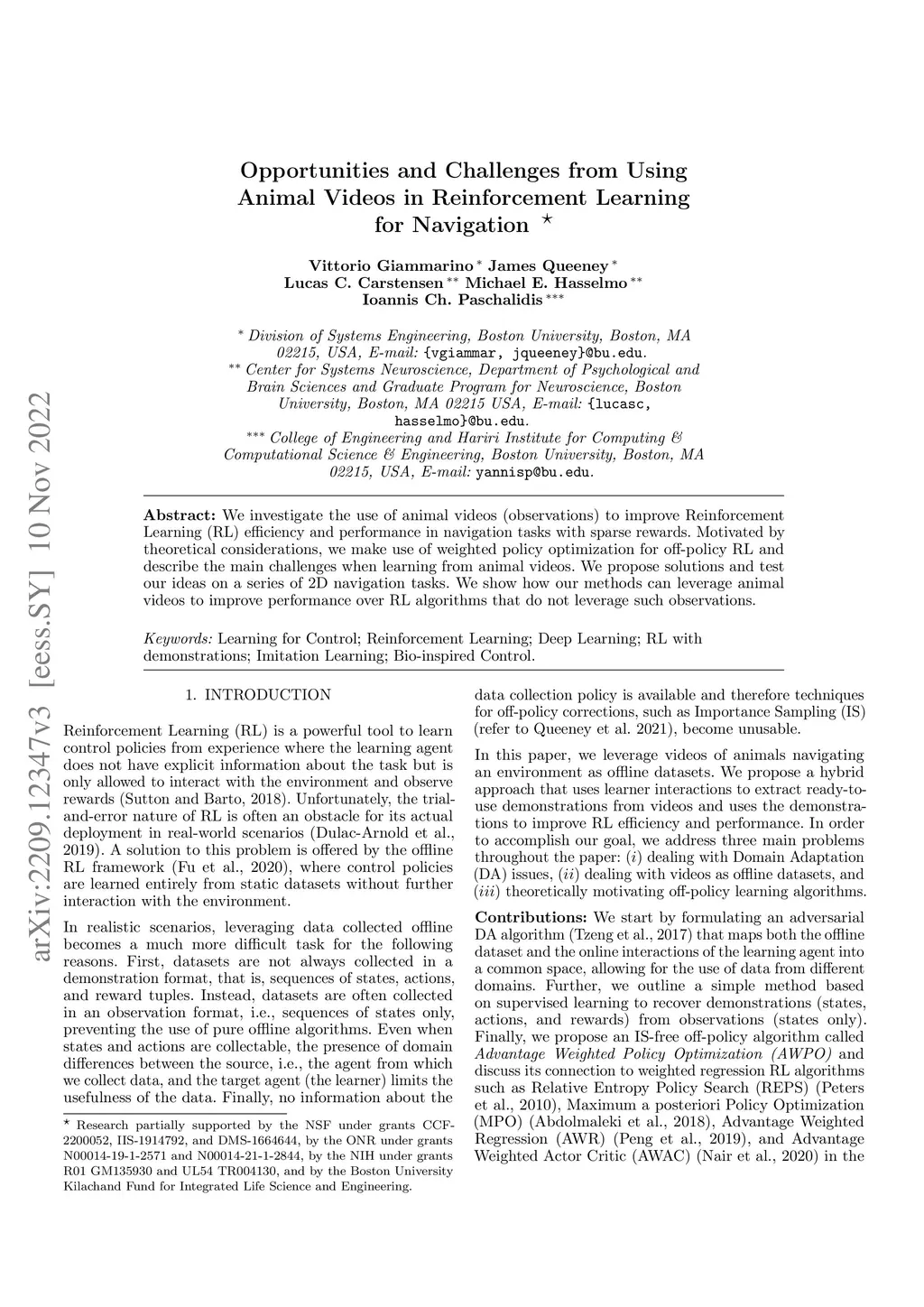 We investigate the use of animal videos (observations) to improve Reinforcement Learning (RL) efficiency and performance in navigation tasks with sparse rewards. Motivated by theoretical considerations, we make use of weighted policy optimization for off-policy RL and describe the main challenges when learning from animal videos. We propose solutions and test our ideas on a series of 2D navigation tasks. We show how our methods can leverage animal videos to improve performance over RL algorithms that do not leverage such observations.