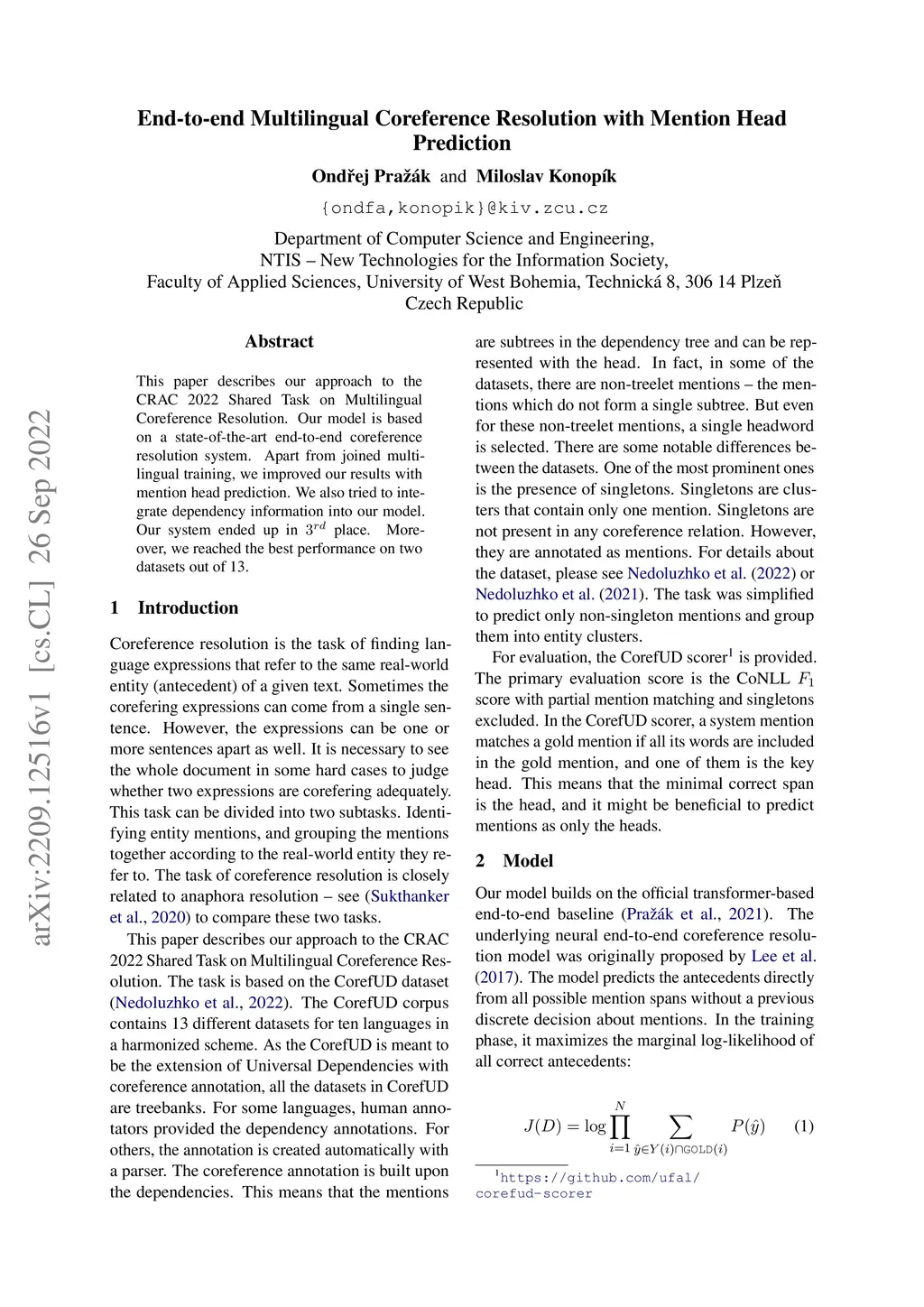 This paper describes our approach to the CRAC 2022 Shared Task on Multilingual Coreference Resolution. Our model is based on a state-of-the-art end-to-end coreference resolution system. Apart from joined multilingual training, we improved our results with mention head prediction. We also tried to integrate dependency information into our model. Our system ended up in place. Moreover, we reached the best performance on two datasets out of 13.