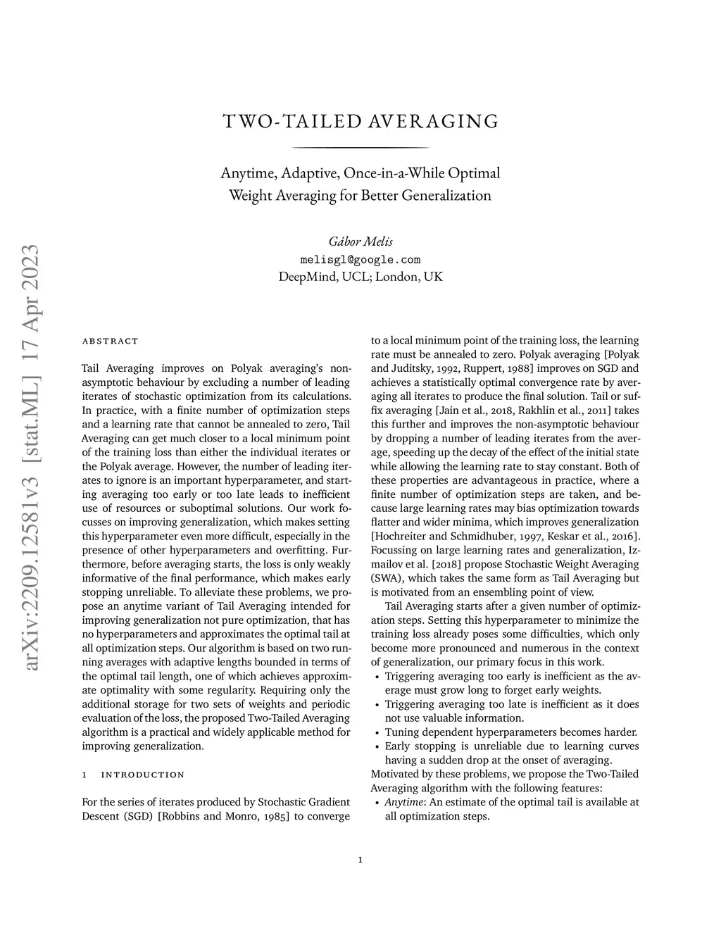 Tail Averaging improves on Polyak averaging's non-asymptotic behaviour by excluding a number of leading iterates of stochastic optimization from its calculations. In practice, with a finite number of optimization steps and a learning rate that cannot be annealed to zero, Tail Averaging can get much closer to a local minimum point of the training loss than either the individual iterates or the Polyak average. However, the number of leading iterates to ignore is an important hyperparameter, and starting averaging too early or too late leads to inefficient use of resources or suboptimal solutions. Our work focusses on improving generalization, which makes setting this hyperparameter even more difficult, especially in the presence of other hyperparameters and overfitting. Furthermore, before averaging starts, the loss is only weakly informative of the final performance, which makes early stopping unreliable. To alleviate these problems, we propose an anytime variant of Tail Averaging intended for improving generalization not pure optimization, that has no hyperparameters and approximates the optimal tail at all optimization steps. Our algorithm is based on two running averages with adaptive lengths bounded in terms of the optimal tail length, one of which achieves approximate optimality with some regularity. Requiring only the additional storage for two sets of weights and periodic evaluation of the loss, the proposed Two-Tailed Averaging algorithm is a practical and widely applicable method for improving generalization.