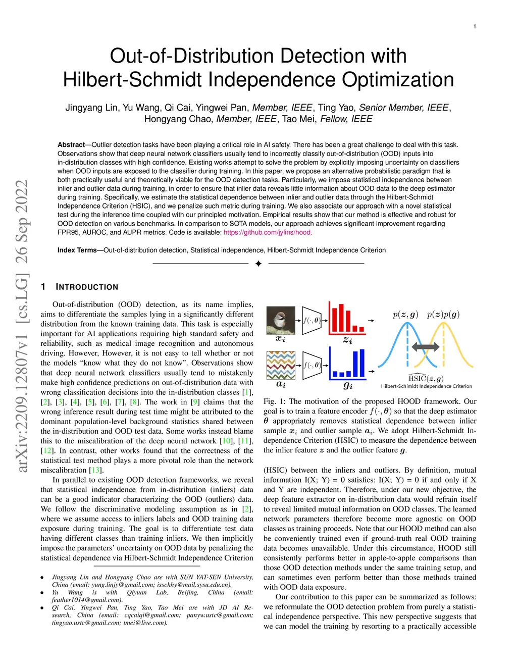 Outlier detection tasks have been playing a critical role in AI safety. There has been a great challenge to deal with this task. Observations show that deep neural network classifiers usually tend to incorrectly classify out-of-distribution (OOD) inputs into in-distribution classes with high confidence. Existing works attempt to solve the problem by explicitly imposing uncertainty on classifiers when OOD inputs are exposed to the classifier during training. In this paper, we propose an alternative probabilistic paradigm that is both practically useful and theoretically viable for the OOD detection tasks. Particularly, we impose statistical independence between inlier and outlier data during training, in order to ensure that inlier data reveals little information about OOD data to the deep estimator during training. Specifically, we estimate the statistical dependence between inlier and outlier data through the Hilbert-Schmidt Independence Criterion (HSIC), and we penalize such metric during training. We also associate our approach with a novel statistical test during the inference time coupled with our principled motivation. Empirical results show that our method is effective and robust for OOD detection on various benchmarks. In comparison to SOTA models, our approach achieves significant improvement regarding FPR95, AUROC, and AUPR metrics. Code is available: \url{https://github.com/jylins/hood}.