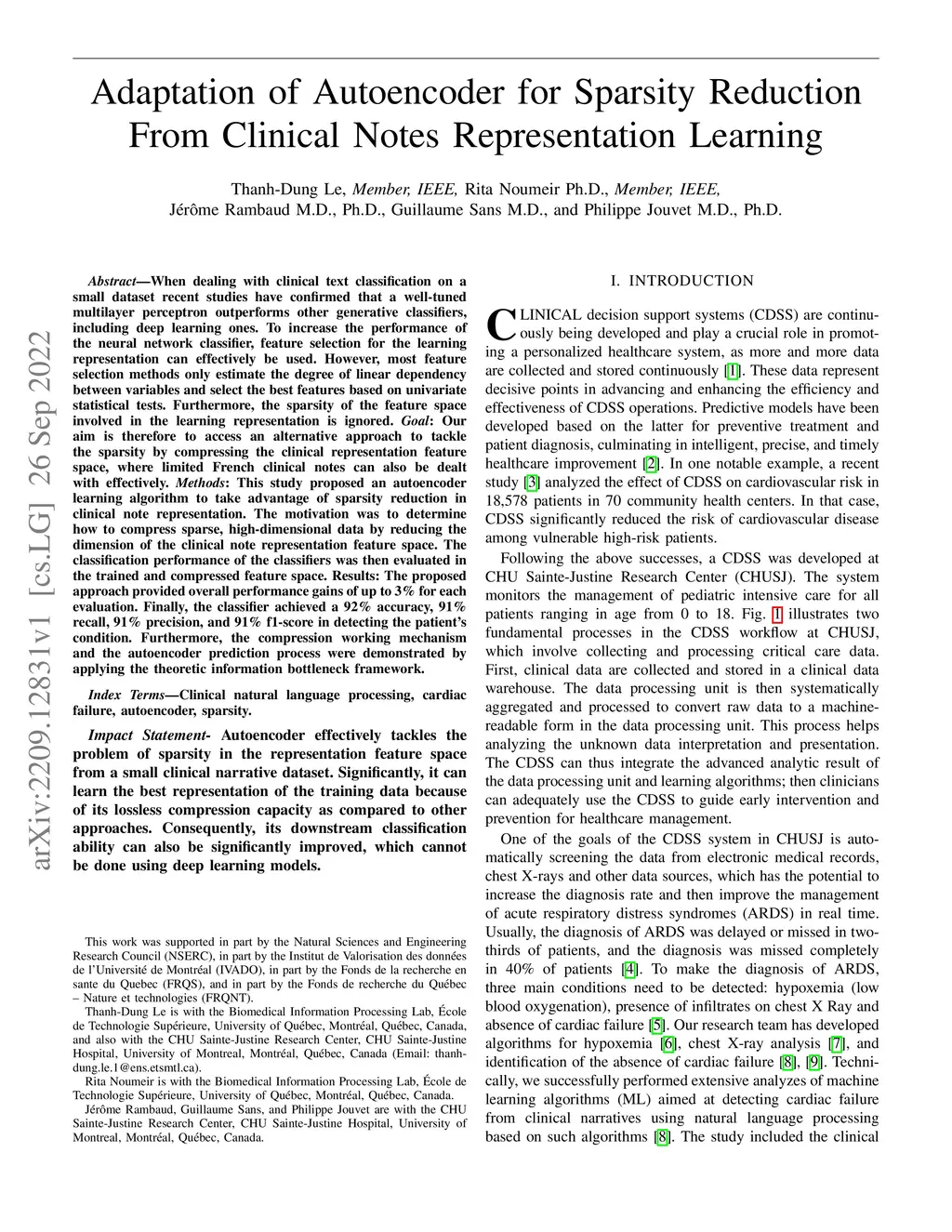 When dealing with clinical text classification on a small dataset recent studies have confirmed that a well-tuned multilayer perceptron outperforms other generative classifiers, including deep learning ones. To increase the performance of the neural network classifier, feature selection for the learning representation can effectively be used. However, most feature selection methods only estimate the degree of linear dependency between variables and select the best features based on univariate statistical tests. Furthermore, the sparsity of the feature space involved in the learning representation is ignored. Goal: Our aim is therefore to access an alternative approach to tackle the sparsity by compressing the clinical representation feature space, where limited French clinical notes can also be dealt with effectively. Methods: This study proposed an autoencoder learning algorithm to take advantage of sparsity reduction in clinical note representation. The motivation was to determine how to compress sparse, high-dimensional data by reducing the dimension of the clinical note representation feature space. The classification performance of the classifiers was then evaluated in the trained and compressed feature space. Results: The proposed approach provided overall performance gains of up to 3% for each evaluation. Finally, the classifier achieved a 92% accuracy, 91% recall, 91% precision, and 91% f1-score in detecting the patient's condition. Furthermore, the compression working mechanism and the autoencoder prediction process were demonstrated by applying the theoretic information bottleneck framework.