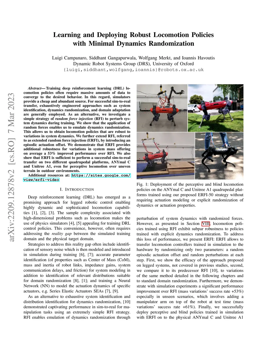 Training deep reinforcement learning (DRL) locomotion policies often require massive amounts of data to converge to the desired behaviour. In this regard, simulators provide a cheap and abundant source. For successful sim-to-real transfer, exhaustively engineered approaches such as system identification, dynamics randomization, and domain adaptation are generally employed. As an alternative, we investigate a simple strategy of random force injection (RFI) to perturb system dynamics during training. We show that the application of random forces enables us to emulate dynamics randomization. This allows us to obtain locomotion policies that are robust to variations in system dynamics. We further extend RFI, referred to as extended random force injection (ERFI), by introducing an episodic actuation offset. We demonstrate that ERFI provides additional robustness for variations in system mass offering on average a 53% improved performance over RFI. We also show that ERFI is sufficient to perform a successful sim-to-real transfer on two different quadrupedal platforms, ANYmal C and Unitree A1, even for perceptive locomotion over uneven terrain in outdoor environments.