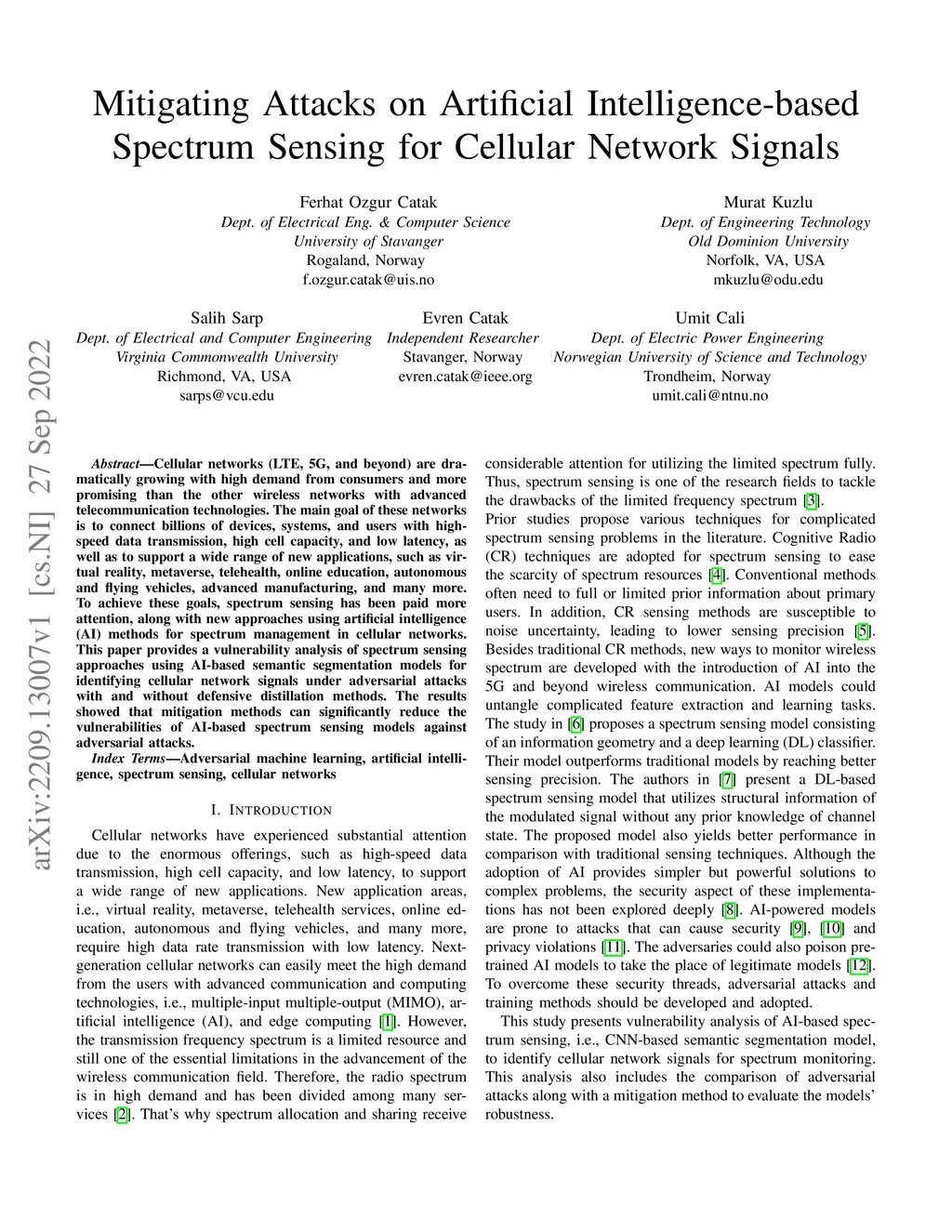 Cellular networks (LTE, 5G, and beyond) are dramatically growing with high demand from consumers and more promising than the other wireless networks with advanced telecommunication technologies. The main goal of these networks is to connect billions of devices, systems, and users with high-speed data transmission, high cell capacity, and low latency, as well as to support a wide range of new applications, such as virtual reality, metaverse, telehealth, online education, autonomous and flying vehicles, advanced manufacturing, and many more. To achieve these goals, spectrum sensing has been paid more attention, along with new approaches using artificial intelligence (AI) methods for spectrum management in cellular networks. This paper provides a vulnerability analysis of spectrum sensing approaches using AI-based semantic segmentation models for identifying cellular network signals under adversarial attacks with and without defensive distillation methods. The results showed that mitigation methods can significantly reduce the vulnerabilities of AI-based spectrum sensing models against adversarial attacks.