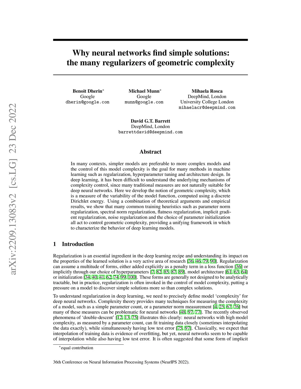 In many contexts, simpler models are preferable to more complex models and the control of this model complexity is the goal for many methods in machine learning such as regularization, hyperparameter tuning and architecture design. In deep learning, it has been difficult to understand the underlying mechanisms of complexity control, since many traditional measures are not naturally suitable for deep neural networks. Here we develop the notion of geometric complexity, which is a measure of the variability of the model function, computed using a discrete Dirichlet energy. Using a combination of theoretical arguments and empirical results, we show that many common training heuristics such as parameter norm regularization, spectral norm regularization, flatness regularization, implicit gradient regularization, noise regularization and the choice of parameter initialization all act to control geometric complexity, providing a unifying framework in which to characterize the behavior of deep learning models.