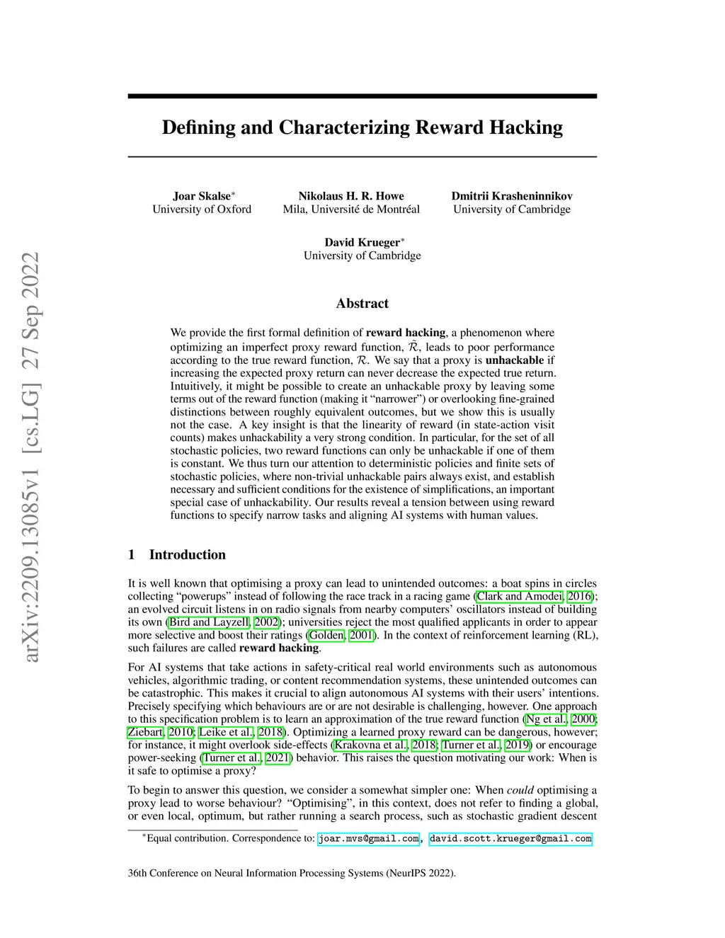 We provide the first formal definition of reward hacking, a phenomenon where optimizing an imperfect proxy reward function leads to poor performance according to the true reward function. We say that a proxy is unhackable if increasing the expected proxy return can never decrease the expected true return. Intuitively, it might be possible to create an unhackable proxy by leaving some terms out of the reward function (making it "narrower") or overlooking fine-grained distinctions between roughly equivalent outcomes, but we show this is usually not the case. A key insight is that the linearity of reward (in state-action visit counts) makes unhackability a very strong condition. In particular, for the set of all stochastic policies, two reward functions can only be unhackable if one of them is constant. We thus turn our attention to deterministic policies and finite sets of stochastic policies, where non-trivial unhackable pairs always exist, and establish necessary and sufficient conditions for the existence of simplifications, an important special case of unhackability. Our results reveal a tension between using reward functions to specify narrow tasks and aligning AI systems with human values.