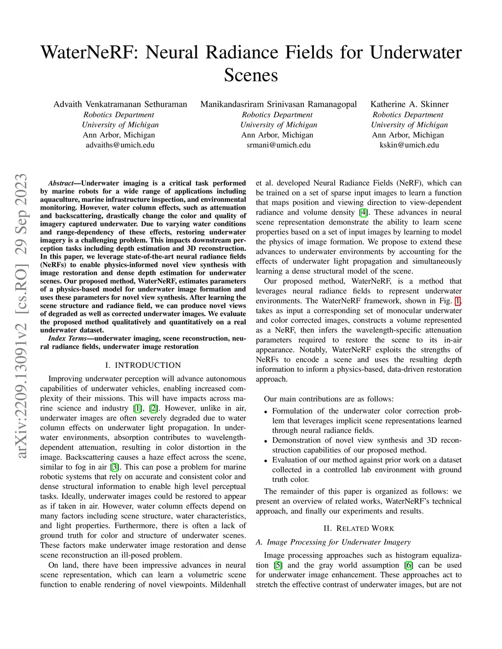 Underwater imaging is a critical task performed by marine robots for a wide range of applications including aquaculture, marine infrastructure inspection, and environmental monitoring. However, water column effects, such as attenuation and backscattering, drastically change the color and quality of imagery captured underwater. Due to varying water conditions and range-dependency of these effects, restoring underwater imagery is a challenging problem. This impacts downstream perception tasks including depth estimation and 3D reconstruction. In this paper, we advance state-of-the-art in neural radiance fields (NeRFs) to enable physics-informed dense depth estimation and color correction. Our proposed method, WaterNeRF, estimates parameters of a physics-based model for underwater image formation, leading to a hybrid data-driven and model-based solution. After determining the scene structure and radiance field, we can produce novel views of degraded as well as corrected underwater images, along with dense depth of the scene. We evaluate the proposed method qualitatively and quantitatively on a real underwater dataset.