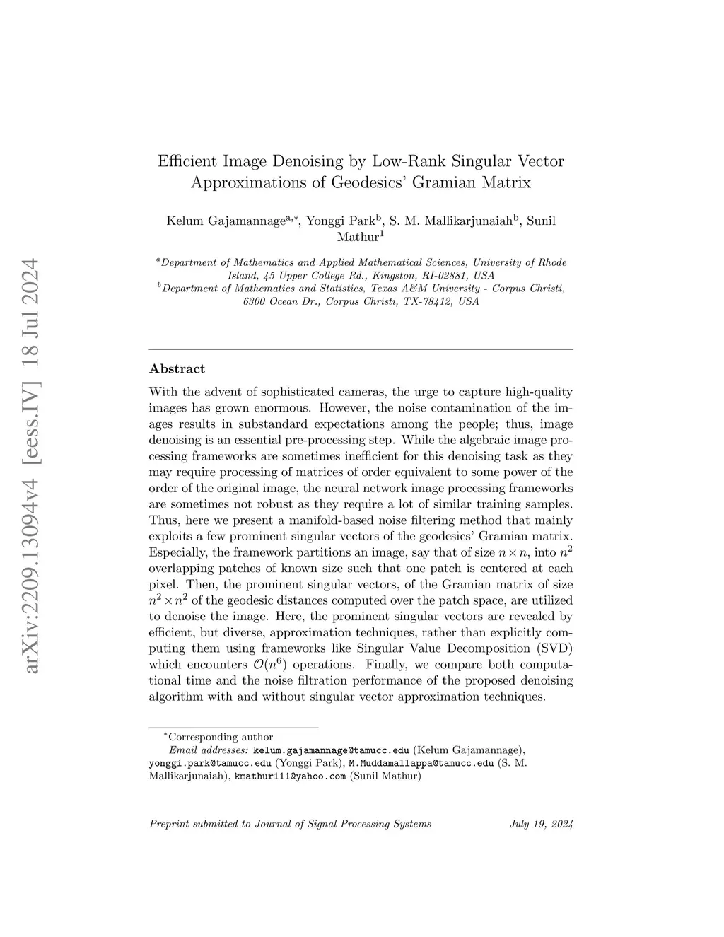 With the advent of sophisticated cameras, the urge to capture high-quality images has grown enormous. However, the noise contamination of the images results in substandard expectations among the people; thus, image denoising is an essential pre-processing step. While the algebraic image processing frameworks are sometimes inefficient for this denoising task as they may require processing of matrices of order equivalent to some power of the order of the original image, the neural network image processing frameworks are sometimes not robust as they require a lot of similar training samples. Thus, here we present a manifold-based noise filtering method that mainly exploits a few prominent singular vectors of the geodesics' Gramian matrix. Especially, the framework partitions an image, say that of size , into overlapping patches of known size such that one patch is centered at each pixel. Then, the prominent singular vectors, of the Gramian matrix of size of the geodesic distances computed over the patch space, are utilized to denoise the image. Here, the prominent singular vectors are revealed by efficient, but diverse, approximation techniques, rather than explicitly computing them using frameworks like Singular Value Decomposition (SVD) which encounters operations. Finally, we compare both computational time and the noise filtration performance of the proposed denoising algorithm with and without singular vector approximation techniques.
