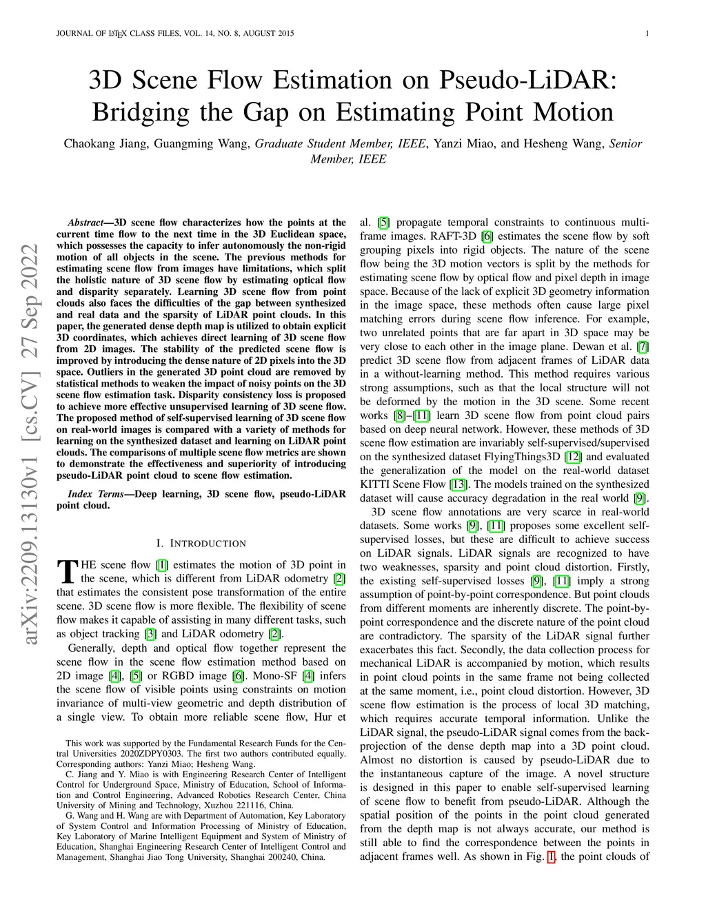 3D scene flow characterizes how the points at the current time flow to the next time in the 3D Euclidean space, which possesses the capacity to infer autonomously the non-rigid motion of all objects in the scene. The previous methods for estimating scene flow from images have limitations, which split the holistic nature of 3D scene flow by estimating optical flow and disparity separately. Learning 3D scene flow from point clouds also faces the difficulties of the gap between synthesized and real data and the sparsity of LiDAR point clouds. In this paper, the generated dense depth map is utilized to obtain explicit 3D coordinates, which achieves direct learning of 3D scene flow from 2D images. The stability of the predicted scene flow is improved by introducing the dense nature of 2D pixels into the 3D space. Outliers in the generated 3D point cloud are removed by statistical methods to weaken the impact of noisy points on the 3D scene flow estimation task. Disparity consistency loss is proposed to achieve more effective unsupervised learning of 3D scene flow. The proposed method of self-supervised learning of 3D scene flow on real-world images is compared with a variety of methods for learning on the synthesized dataset and learning on LiDAR point clouds. The comparisons of multiple scene flow metrics are shown to demonstrate the effectiveness and superiority of introducing pseudo-LiDAR point cloud to scene flow estimation.