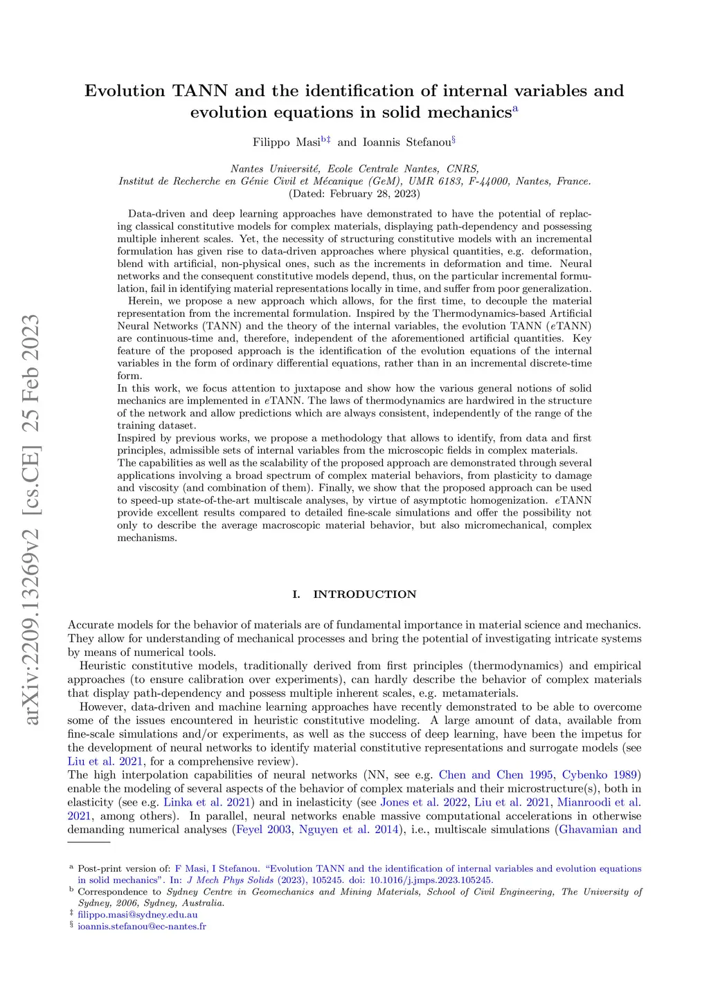 Data-driven and deep learning approaches have demonstrated to have the potential of replacing classical constitutive models for complex materials. Yet, the necessity of structuring constitutive models with an incremental formulation has given rise to data-driven approaches where physical quantities, e.g. deformation, blend with artificial, non-physical ones, such as the increments in deformation and time. Neural networks and the consequent constitutive models depend, thus, on the particular incremental formulation, fail in identifying material representations locally in time, and suffer from poor generalization. Herein, we propose a new approach which allows, for the first time, to decouple the material representation from the incremental formulation. Inspired by the Thermodynamics-based Artificial Neural Networks (TANN) and the theory of the internal variables, the evolution TANN (eTANN) are continuous-time and, therefore, independent of the aforementioned artificial quantities. Key feature of the proposed approach is the identification of the evolution equations of the internal variables in the form of ordinary differential equations, rather than in an incremental discrete-time form. In this work, we focus attention to juxtapose and show how the various general notions of solid mechanics are implemented in eTANN. The capabilities as well as the scalability of the proposed approach are demonstrated through several applications involving a broad spectrum of complex material behaviors, from plasticity to damage and viscosity (and combination of them). Finally, we show that the proposed approach can be used to speed-up multiscale analyses, by virtue of asymptotic homogenization. eTANN provide excellent results compared to detailed fine-scale simulations and offer the possibility not only to describe the average macroscopic material behavior, but also micromechanical, complex mechanisms.