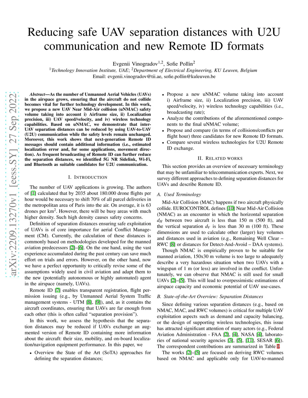 As the number of Unmanned Aerial Vehicles (UAVs) in the airspace grows, ensuring that the aircraft do not collide becomes vital for further technology development. In this work, we propose a new UAV Near Mid-Air collision (uNMAC) safety volume taking into account i) Airframe size, ii) Localization precision, iii) UAV speed/velocity, and iv) wireless technology capabilities. Based on uNMAC, we demonstrate that inter-UAV separation distances can be reduced by using UAV-to-UAV (U2U) communication while the safety levels remain unchanged. Moreover, this work shows that next-generation Remote ID messages should contain additional information (i.e., estimated localization error and, for some applications, movement direction). As frequent broadcasting of Remote ID can further reduce the separation distances, we identified 5G NR Sidelink, Wi-Fi, and Bluetooth as suitable candidates for U2U communication.