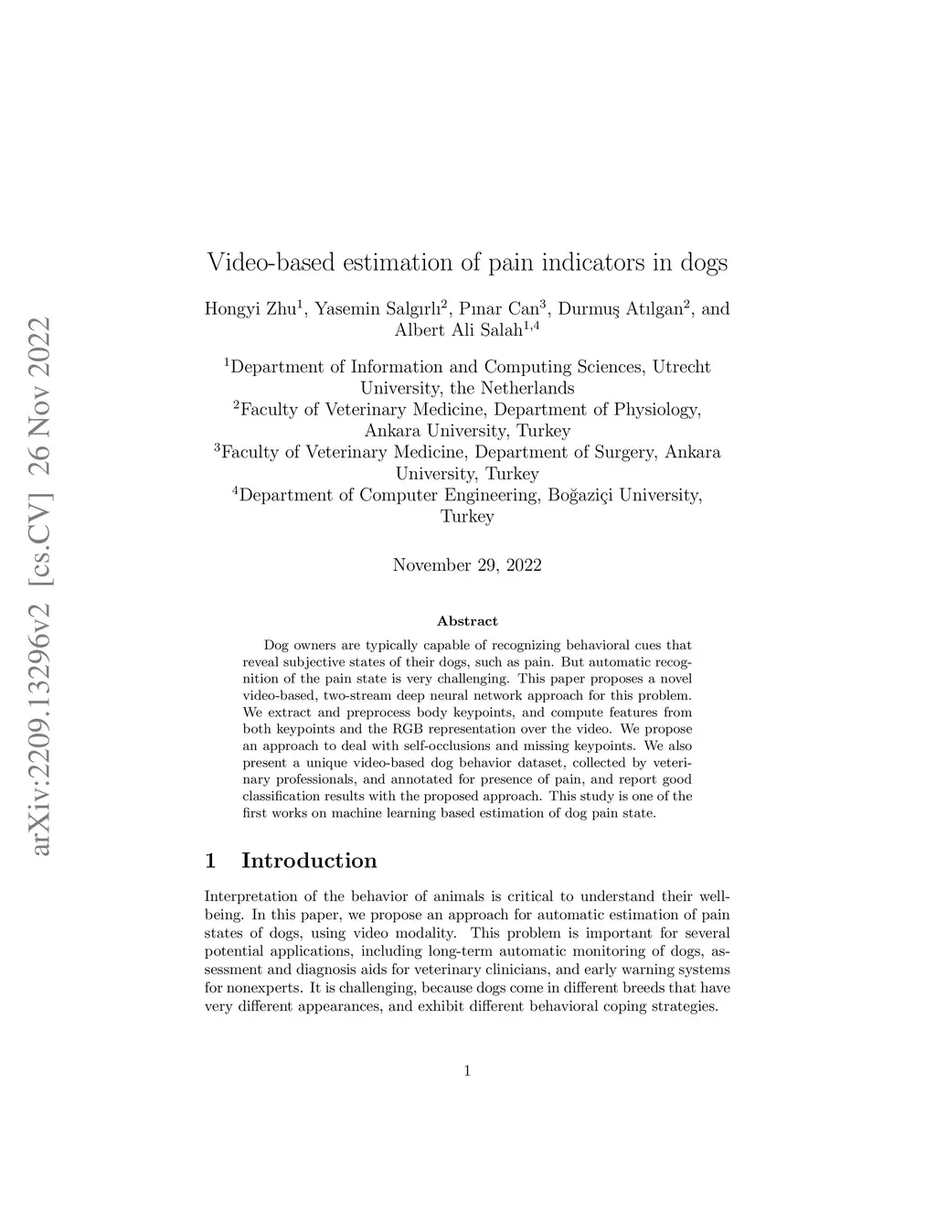 Dog owners are typically capable of recognizing behavioral cues that reveal subjective states of their dogs, such as pain. But automatic recognition of the pain state is very challenging. This paper proposes a novel video-based, two-stream deep neural network approach for this problem. We extract and preprocess body keypoints, and compute features from both keypoints and the RGB representation over the video. We propose an approach to deal with self-occlusions and missing keypoints. We also present a unique video-based dog behavior dataset, collected by veterinary professionals, and annotated for presence of pain, and report good classification results with the proposed approach. This study is one of the first works on machine learning based estimation of dog pain state.