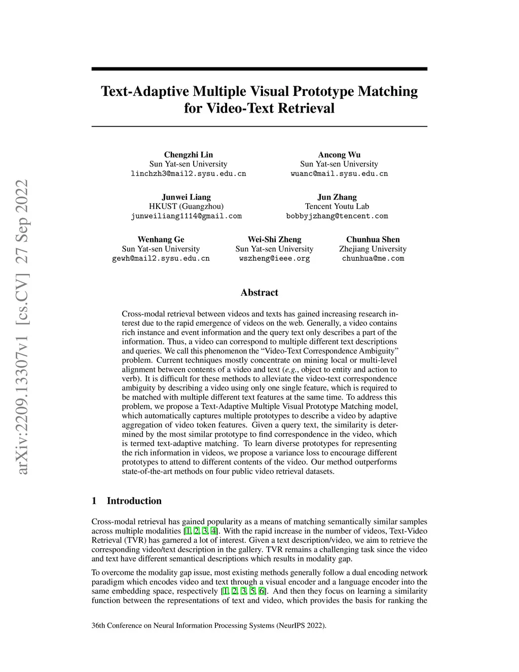 Cross-modal retrieval between videos and texts has gained increasing research interest due to the rapid emergence of videos on the web. Generally, a video contains rich instance and event information and the query text only describes a part of the information. Thus, a video can correspond to multiple different text descriptions and queries. We call this phenomenon the ``Video-Text Correspondence Ambiguity'' problem. Current techniques mostly concentrate on mining local or multi-level alignment between contents of a video and text (\textit{e.g.}, object to entity and action to verb). It is difficult for these methods to alleviate the video-text correspondence ambiguity by describing a video using only one single feature, which is required to be matched with multiple different text features at the same time. To address this problem, we propose a Text-Adaptive Multiple Visual Prototype Matching model, which automatically captures multiple prototypes to describe a video by adaptive aggregation of video token features. Given a query text, the similarity is determined by the most similar prototype to find correspondence in the video, which is termed text-adaptive matching. To learn diverse prototypes for representing the rich information in videos, we propose a variance loss to encourage different prototypes to attend to different contents of the video. Our method outperforms state-of-the-art methods on four public video retrieval datasets.