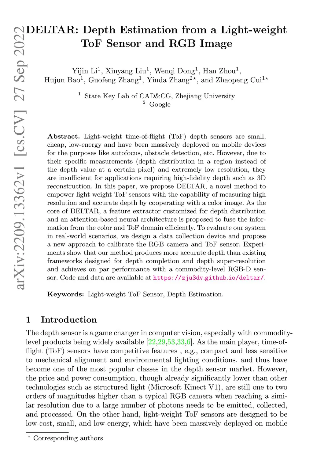 DELTAR: Depth Estimation from a Light-weight ToF Sensor and RGB Image