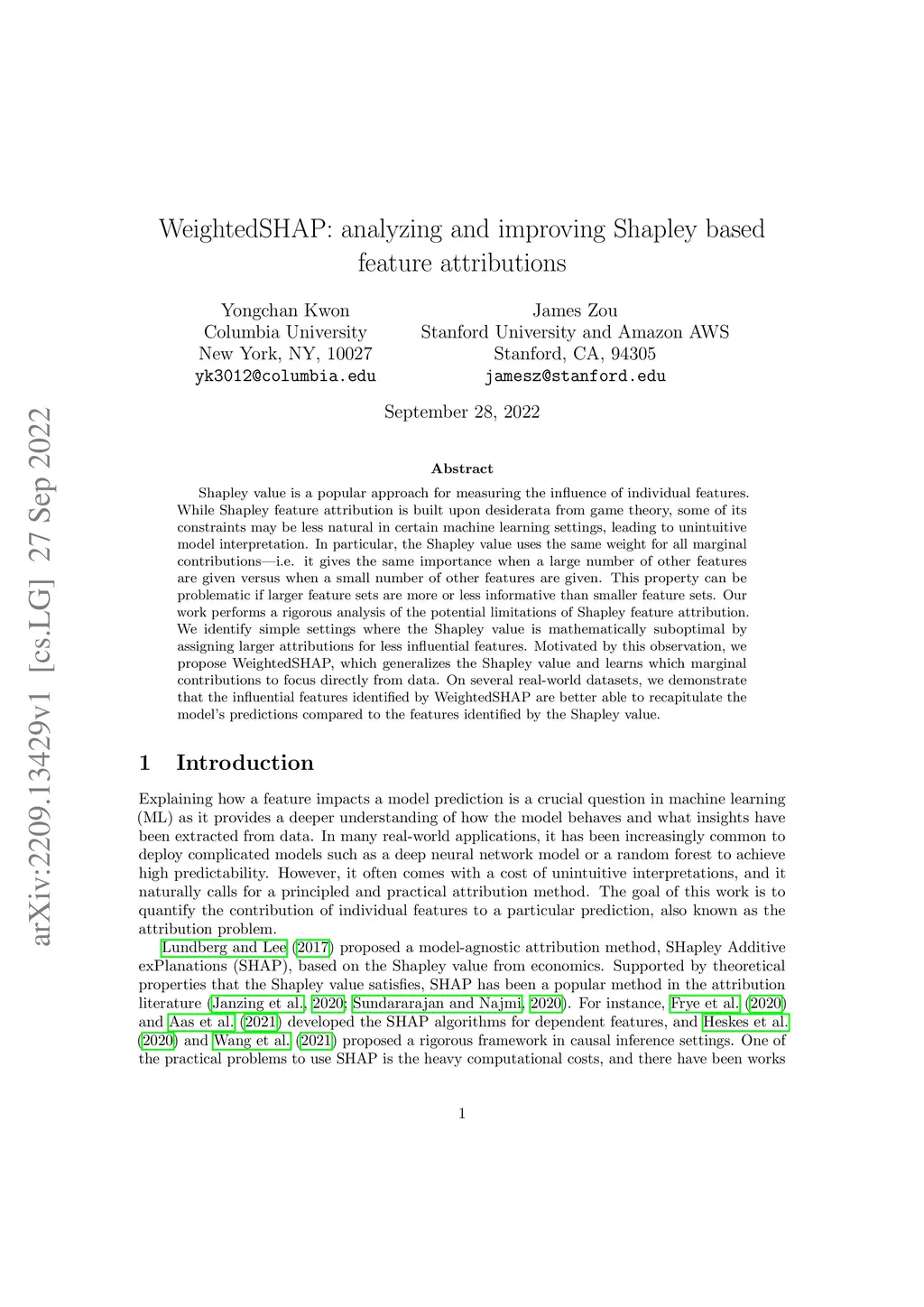 Shapley value is a popular approach for measuring the influence of individual features. While Shapley feature attribution is built upon desiderata from game theory, some of its constraints may be less natural in certain machine learning settings, leading to unintuitive model interpretation. In particular, the Shapley value uses the same weight for all marginal contributions -- i.e. it gives the same importance when a large number of other features are given versus when a small number of other features are given. This property can be problematic if larger feature sets are more or less informative than smaller feature sets. Our work performs a rigorous analysis of the potential limitations of Shapley feature attribution. We identify simple settings where the Shapley value is mathematically suboptimal by assigning larger attributions for less influential features. Motivated by this observation, we propose WeightedSHAP, which generalizes the Shapley value and learns which marginal contributions to focus directly from data. On several real-world datasets, we demonstrate that the influential features identified by WeightedSHAP are better able to recapitulate the model's predictions compared to the features identified by the Shapley value.