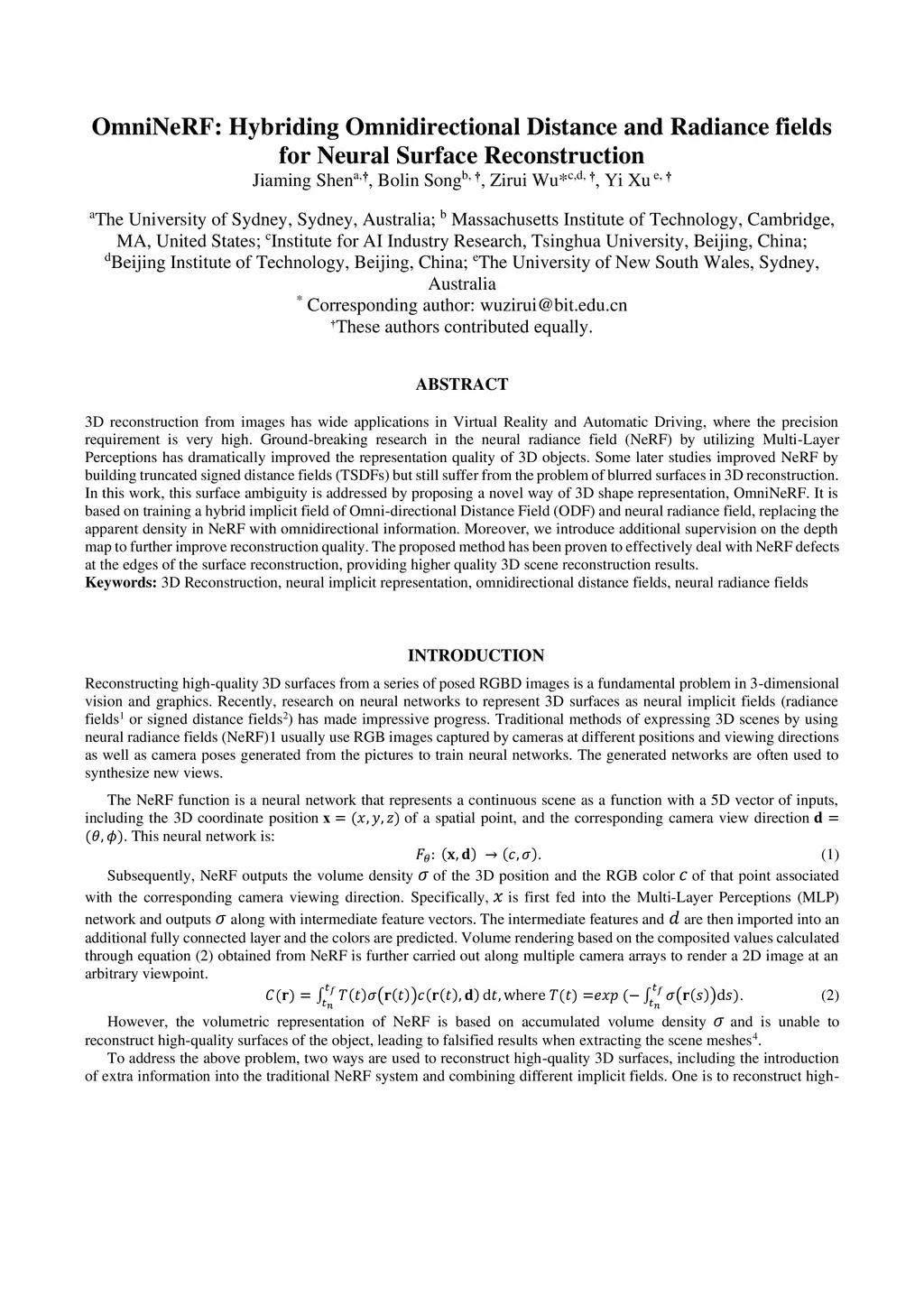 3D reconstruction from images has wide applications in Virtual Reality and Automatic Driving, where the precision requirement is very high. Ground-breaking research in the neural radiance field (NeRF) by utilizing Multi-Layer Perceptions has dramatically improved the representation quality of 3D objects. Some later studies improved NeRF by building truncated signed distance fields (TSDFs) but still suffer from the problem of blurred surfaces in 3D reconstruction. In this work, this surface ambiguity is addressed by proposing a novel way of 3D shape representation, OmniNeRF. It is based on training a hybrid implicit field of Omni-directional Distance Field (ODF) and neural radiance field, replacing the apparent density in NeRF with omnidirectional information. Moreover, we introduce additional supervision on the depth map to further improve reconstruction quality. The proposed method has been proven to effectively deal with NeRF defects at the edges of the surface reconstruction, providing higher quality 3D scene reconstruction results.