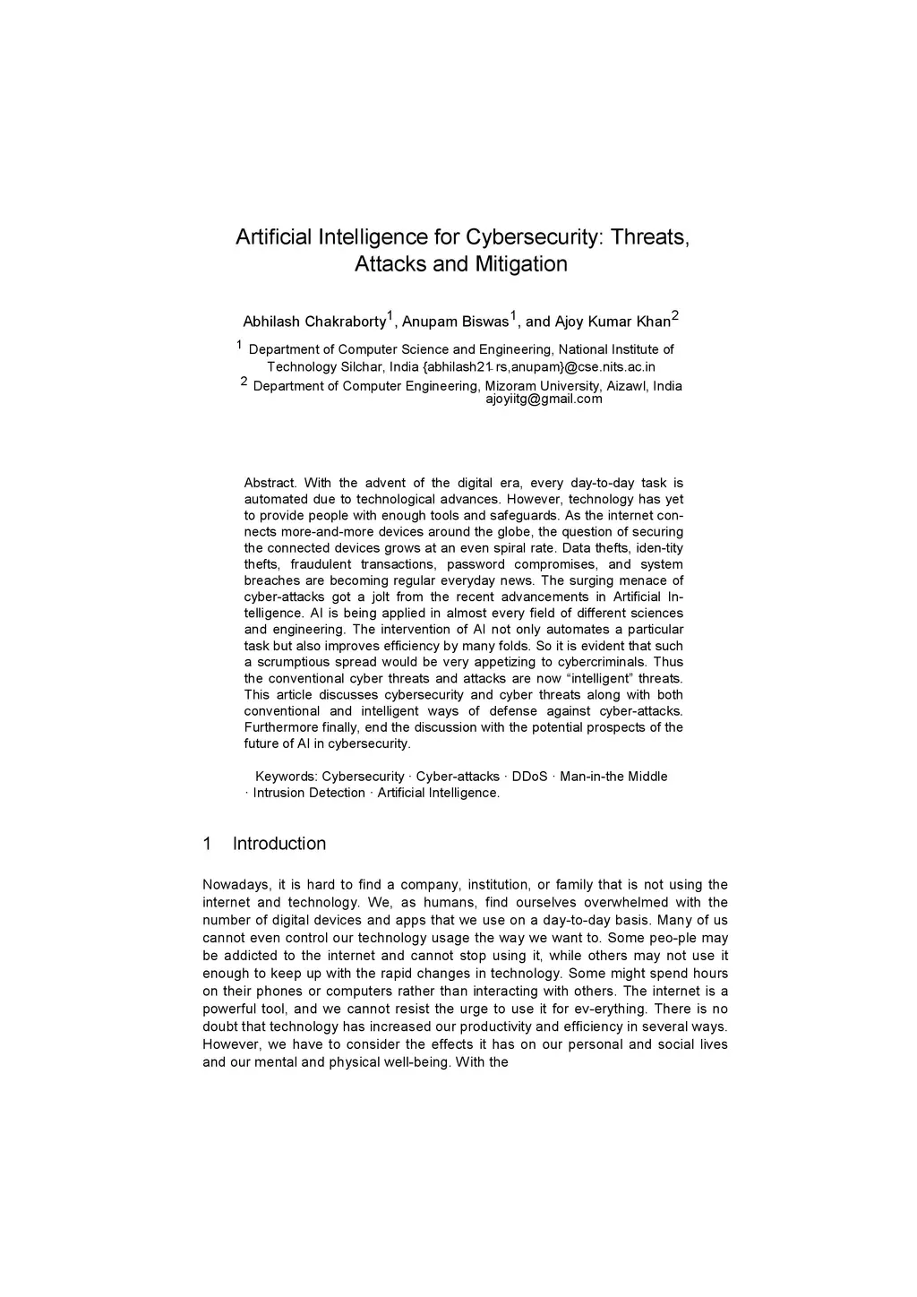 With the advent of the digital era, every day-to-day task is automated due to technological advances. However, technology has yet to provide people with enough tools and safeguards. As the internet connects more-and-more devices around the globe, the question of securing the connected devices grows at an even spiral rate. Data thefts, identity thefts, fraudulent transactions, password compromises, and system breaches are becoming regular everyday news. The surging menace of cyber-attacks got a jolt from the recent advancements in Artificial Intelligence. AI is being applied in almost every field of different sciences and engineering. The intervention of AI not only automates a particular task but also improves efficiency by many folds. So it is evident that such a scrumptious spread would be very appetizing to cybercriminals. Thus the conventional cyber threats and attacks are now ``intelligent" threats. This article discusses cybersecurity and cyber threats along with both conventional and intelligent ways of defense against cyber-attacks. Furthermore finally, end the discussion with the potential prospects of the future of AI in cybersecurity.