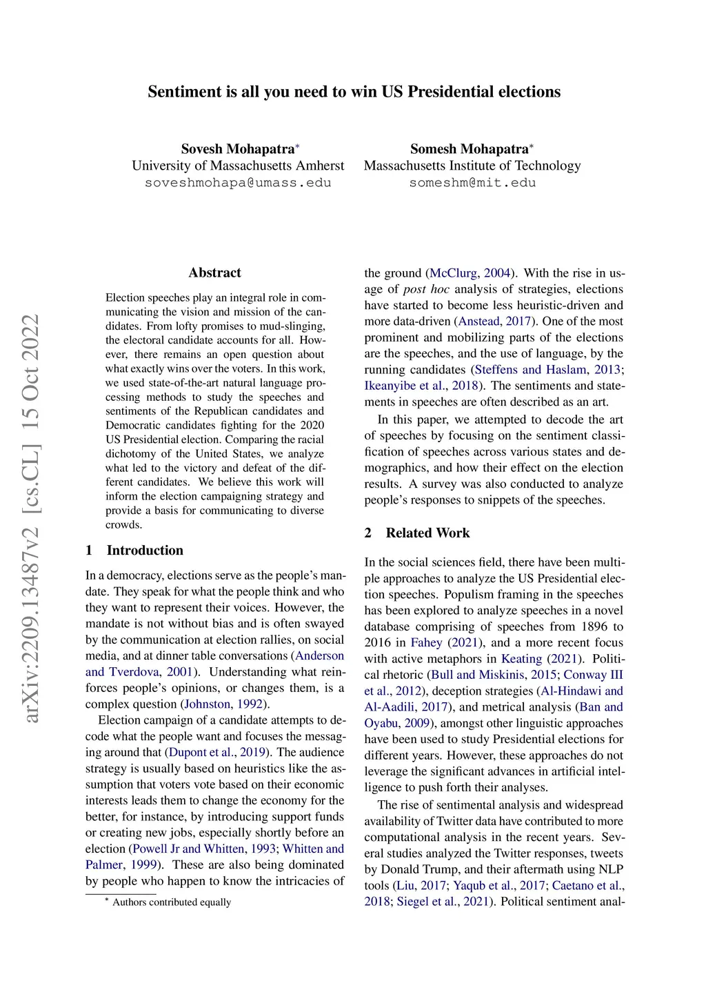 Election speeches play an integral role in communicating the vision and mission of the candidates. From lofty promises to mud-slinging, the electoral candidate accounts for all. However, there remains an open question about what exactly wins over the voters. In this work, we used state-of-the-art natural language processing methods to study the speeches and sentiments of the Republican candidate, Donald Trump, and Democratic candidate, Joe Biden, fighting for the 2020 US Presidential election. Comparing the racial dichotomy of the United States, we analyze what led to the victory and defeat of the different candidates. We believe this work will inform the election campaigning strategy and provide a basis for communicating to diverse crowds.