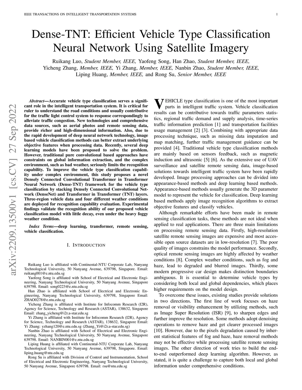 Accurate vehicle type classification serves a significant role in the intelligent transportation system. It is critical for ruler to understand the road conditions and usually contributive for the traffic light control system to response correspondingly to alleviate traffic congestion. New technologies and comprehensive data sources, such as aerial photos and remote sensing data, provide richer and high-dimensional information. Also, due to the rapid development of deep neural network technology, image based vehicle classification methods can better extract underlying objective features when processing data. Recently, several deep learning models have been proposed to solve the problem. However, traditional pure convolutional based approaches have constraints on global information extraction, and the complex environment, such as bad weather, seriously limits the recognition capability. To improve the vehicle type classification capability under complex environment, this study proposes a novel Densely Connected Convolutional Transformer in Transformer Neural Network (Dense-TNT) framework for the vehicle type classification by stacking Densely Connected Convolutional Network (DenseNet) and Transformer in Transformer (TNT) layers. Three-region vehicle data and four different weather conditions are deployed for recognition capability evaluation. Experimental findings validate the recognition ability of our proposed vehicle classification model with little decay, even under the heavy foggy weather condition.