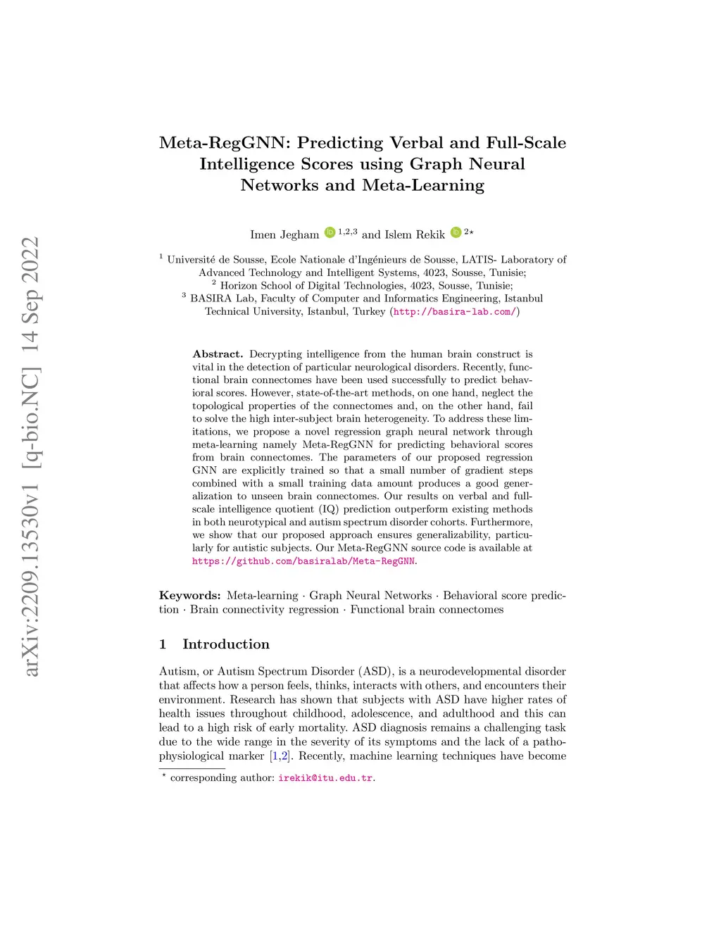 Meta-RegGNN: Predicting Verbal and Full-Scale Intelligence Scores using