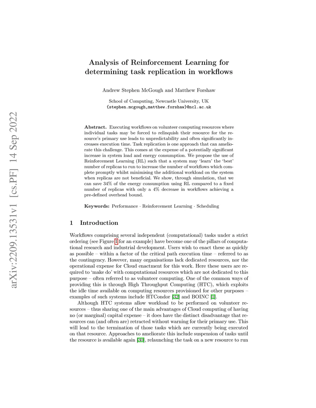 Executing workflows on volunteer computing resources where individual tasks may be forced to relinquish their resource for the resource's primary use leads to unpredictability and often significantly increases execution time. Task replication is one approach that can ameliorate this challenge. This comes at the expense of a potentially significant increase in system load and energy consumption. We propose the use of Reinforcement Learning (RL) such that a system may `learn' the `best' number of replicas to run to increase the number of workflows which complete promptly whilst minimising the additional workload on the system when replicas are not beneficial. We show, through simulation, that we can save 34% of the energy consumption using RL compared to a fixed number of replicas with only a 4% decrease in workflows achieving a pre-defined overhead bound.