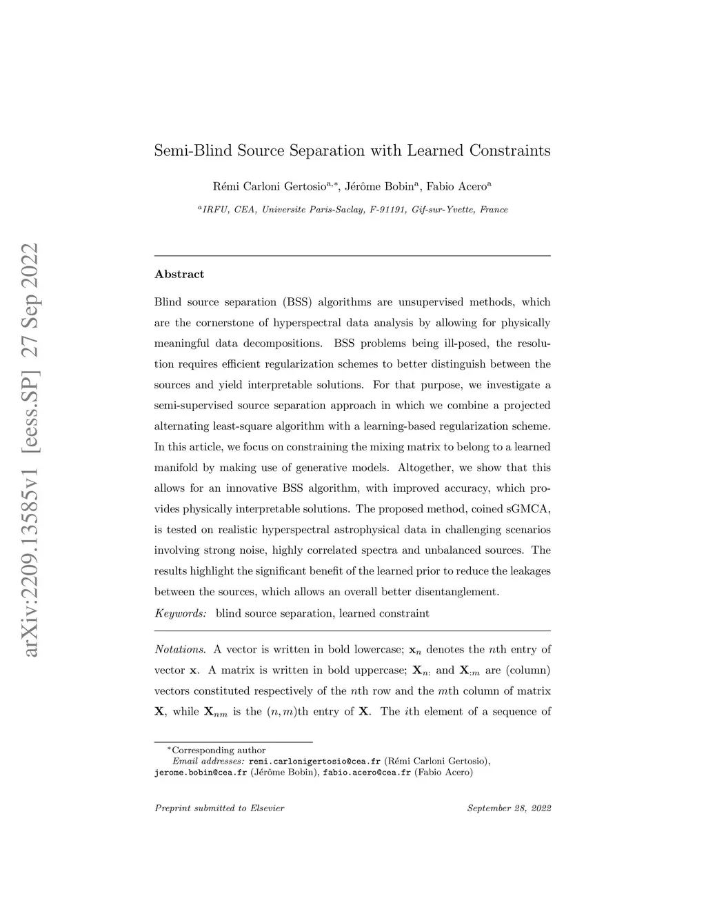 Blind source separation (BSS) algorithms are unsupervised methods, which are the cornerstone of hyperspectral data analysis by allowing for physically meaningful data decompositions. BSS problems being ill-posed, the resolution requires efficient regularization schemes to better distinguish between the sources and yield interpretable solutions. For that purpose, we investigate a semi-supervised source separation approach in which we combine a projected alternating least-square algorithm with a learning-based regularization scheme. In this article, we focus on constraining the mixing matrix to belong to a learned manifold by making use of generative models. Altogether, we show that this allows for an innovative BSS algorithm, with improved accuracy, which provides physically interpretable solutions. The proposed method, coined sGMCA, is tested on realistic hyperspectral astrophysical data in challenging scenarios involving strong noise, highly correlated spectra and unbalanced sources. The results highlight the significant benefit of the learned prior to reduce the leakages between the sources, which allows an overall better disentanglement.