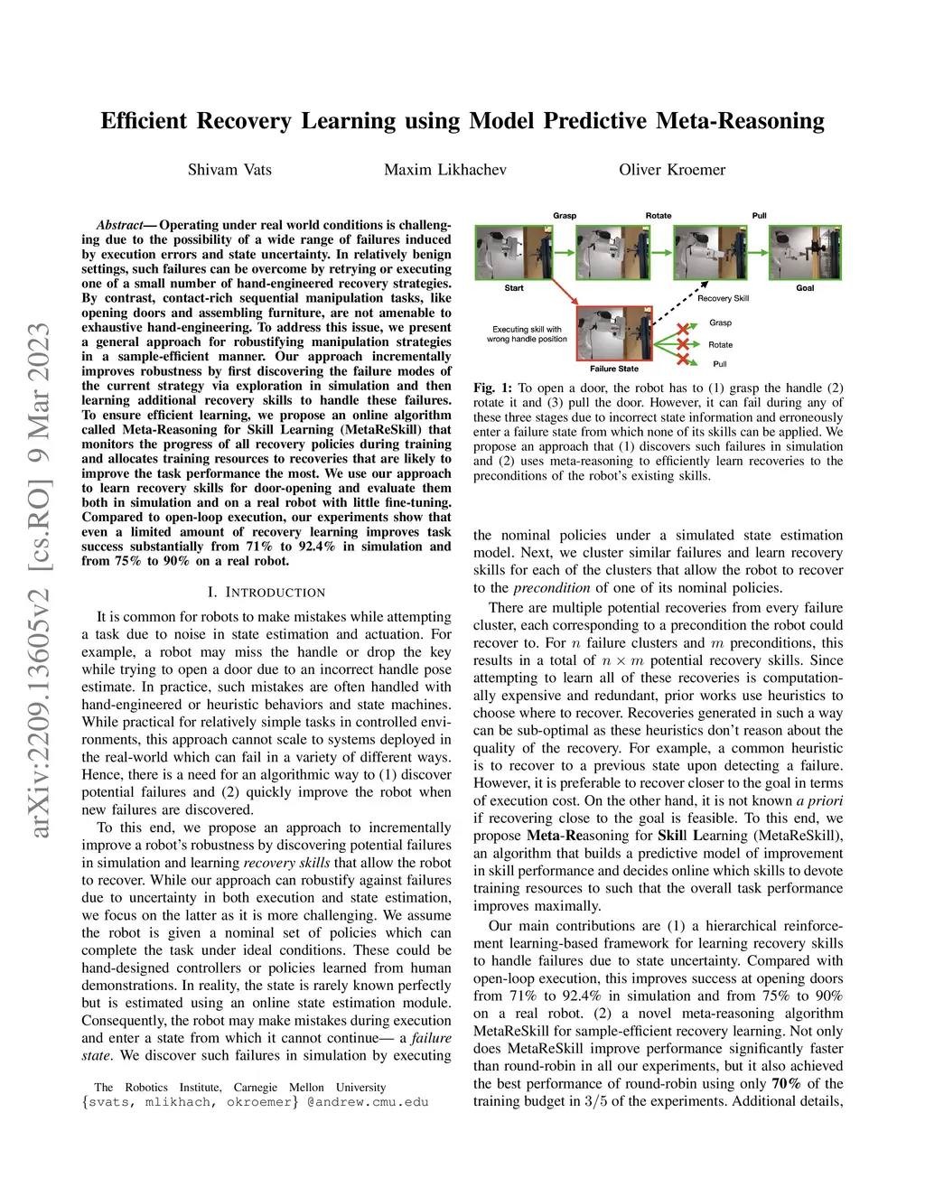 Operating under real world conditions is challenging due to the possibility of a wide range of failures induced by execution errors and state uncertainty. In relatively benign settings, such failures can be overcome by retrying or executing one of a small number of hand-engineered recovery strategies. By contrast, contact-rich sequential manipulation tasks, like opening doors and assembling furniture, are not amenable to exhaustive hand-engineering. To address this issue, we present a general approach for robustifying manipulation strategies in a sample-efficient manner. Our approach incrementally improves robustness by first discovering the failure modes of the current strategy via exploration in simulation and then learning additional recovery skills to handle these failures. To ensure efficient learning, we propose an online algorithm called Meta-Reasoning for Skill Learning (MetaReSkill) that monitors the progress of all recovery policies during training and allocates training resources to recoveries that are likely to improve the task performance the most. We use our approach to learn recovery skills for door-opening and evaluate them both in simulation and on a real robot with little fine-tuning. Compared to open-loop execution, our experiments show that even a limited amount of recovery learning improves task success substantially from 71% to 92.4% in simulation and from 75% to 90% on a real robot.