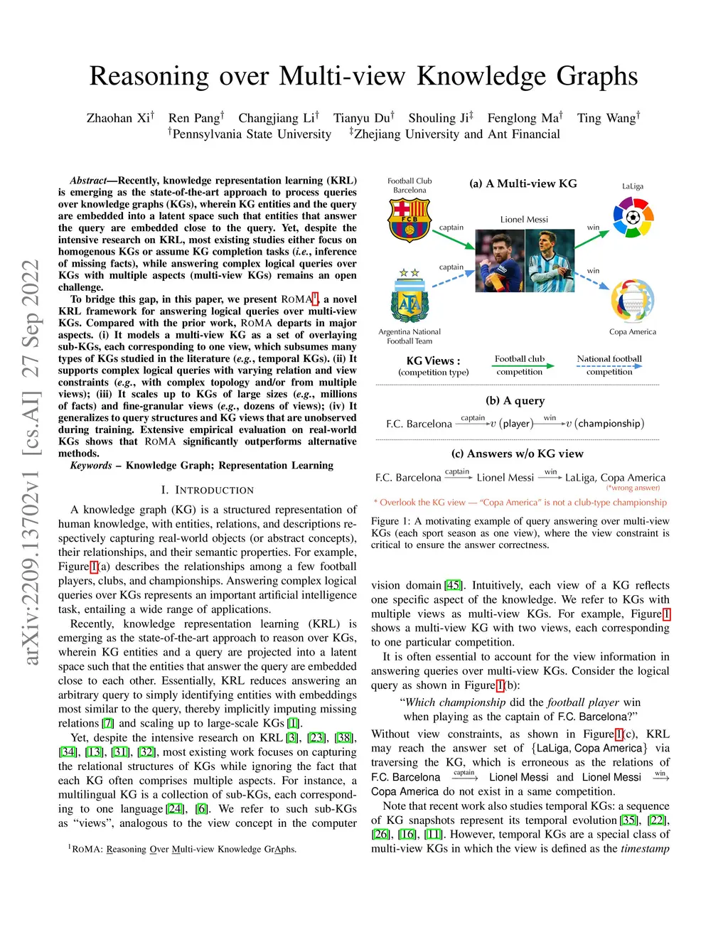 Recently, knowledge representation learning (KRL) is emerging as the state-of-the-art approach to process queries over knowledge graphs (KGs), wherein KG entities and the query are embedded into a latent space such that entities that answer the query are embedded close to the query. Yet, despite the intensive research on KRL, most existing studies either focus on homogenous KGs or assume KG completion tasks (i.e., inference of missing facts), while answering complex logical queries over KGs with multiple aspects (multi-view KGs) remains an open challenge. To bridge this gap, in this paper, we present ROMA, a novel KRL framework for answering logical queries over multi-view KGs. Compared with the prior work, ROMA departs in major aspects. (i) It models a multi-view KG as a set of overlaying sub-KGs, each corresponding to one view, which subsumes many types of KGs studied in the literature (e.g., temporal KGs). (ii) It supports complex logical queries with varying relation and view constraints (e.g., with complex topology and/or from multiple views); (iii) It scales up to KGs of large sizes (e.g., millions of facts) and fine-granular views (e.g., dozens of views); (iv) It generalizes to query structures and KG views that are unobserved during training. Extensive empirical evaluation on real-world KGs shows that \system significantly outperforms alternative methods.