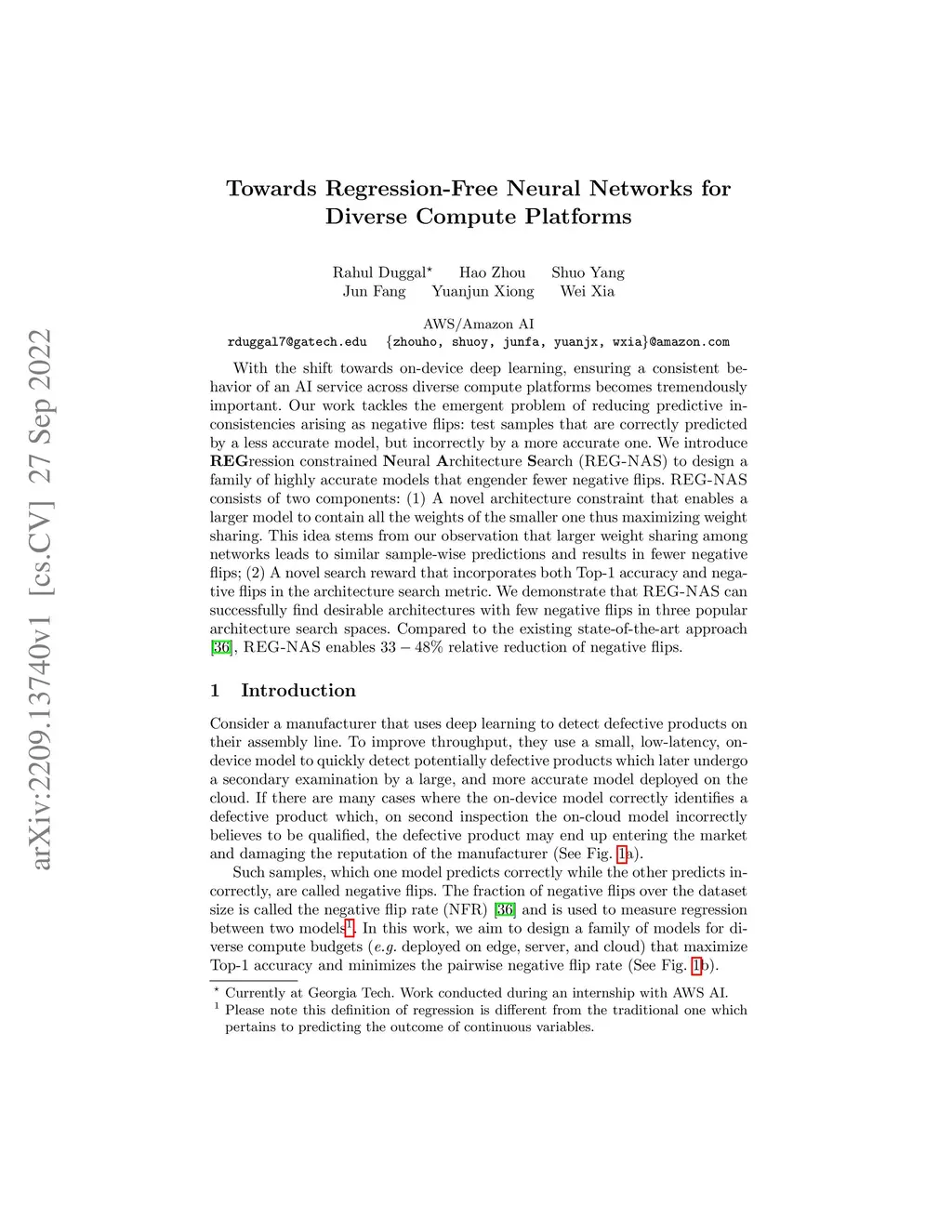 With the shift towards on-device deep learning, ensuring a consistent behavior of an AI service across diverse compute platforms becomes tremendously important. Our work tackles the emergent problem of reducing predictive inconsistencies arising as negative flips: test samples that are correctly predicted by a less accurate model, but incorrectly by a more accurate one. We introduce REGression constrained Neural Architecture Search (REG-NAS) to design a family of highly accurate models that engender fewer negative flips. REG-NAS consists of two components: (1) A novel architecture constraint that enables a larger model to contain all the weights of the smaller one thus maximizing weight sharing. This idea stems from our observation that larger weight sharing among networks leads to similar sample-wise predictions and results in fewer negative flips; (2) A novel search reward that incorporates both Top-1 accuracy and negative flips in the architecture search metric. We demonstrate that \regnas can successfully find desirable architectures with few negative flips in three popular architecture search spaces. Compared to the existing state-of-the-art approach, REG-NAS enables 33-48% relative reduction of negative flips.