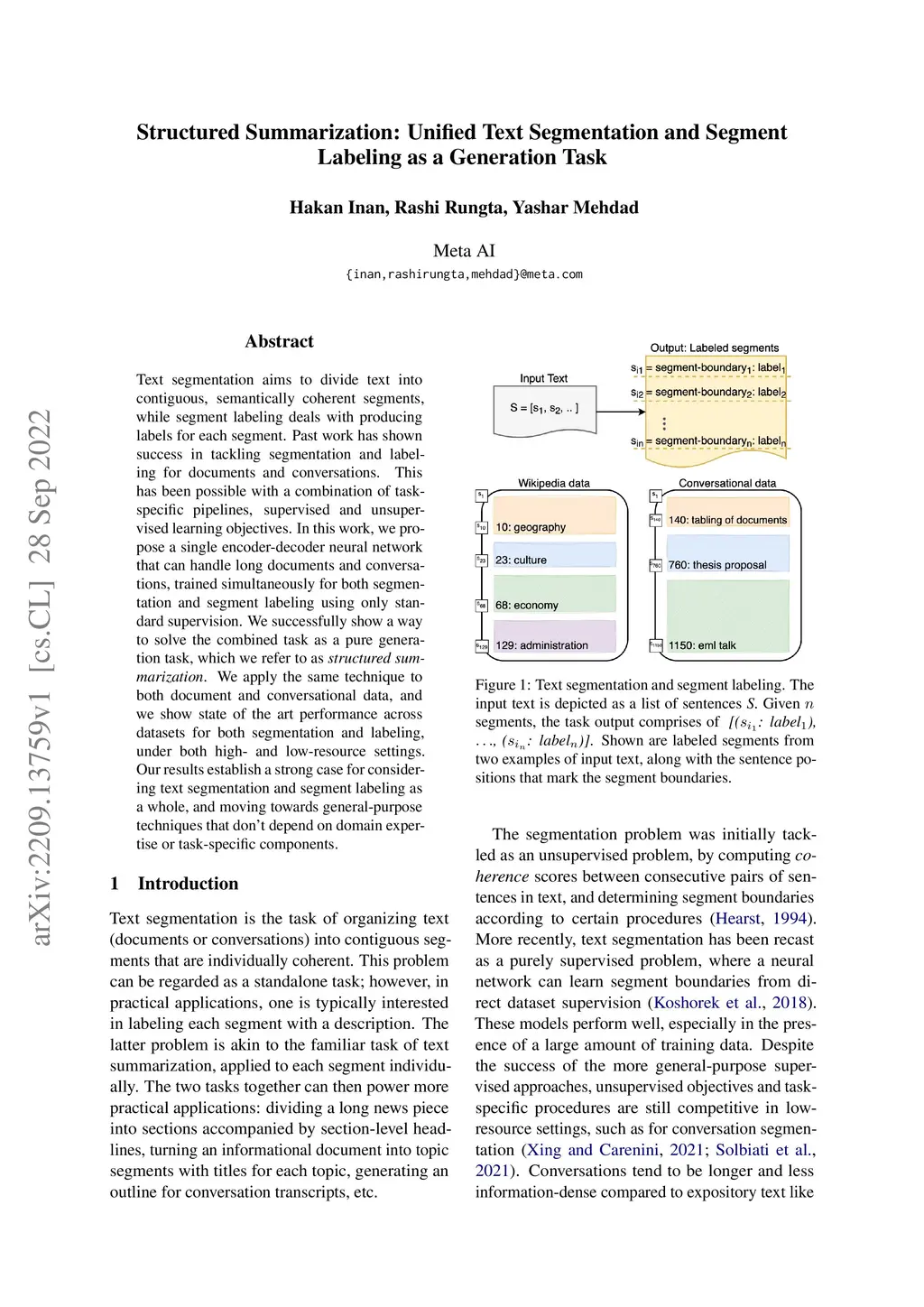 Text segmentation aims to divide text into contiguous, semantically coherent segments, while segment labeling deals with producing labels for each segment. Past work has shown success in tackling segmentation and labeling for documents and conversations. This has been possible with a combination of task-specific pipelines, supervised and unsupervised learning objectives. In this work, we propose a single encoder-decoder neural network that can handle long documents and conversations, trained simultaneously for both segmentation and segment labeling using only standard supervision. We successfully show a way to solve the combined task as a pure generation task, which we refer to as structured summarization. We apply the same technique to both document and conversational data, and we show state of the art performance across datasets for both segmentation and labeling, under both high- and low-resource settings. Our results establish a strong case for considering text segmentation and segment labeling as a whole, and moving towards general-purpose techniques that don't depend on domain expertise or task-specific components.