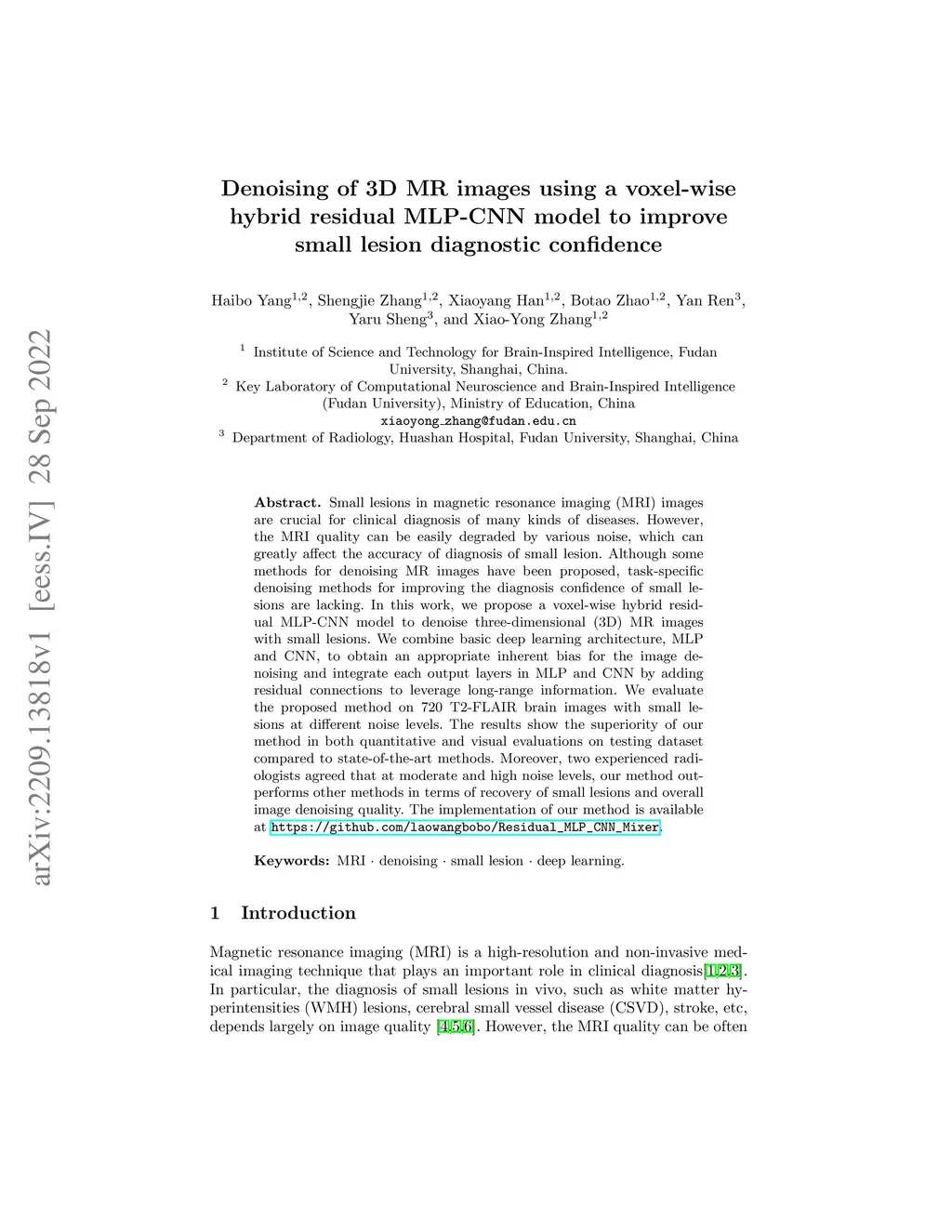 Denoising of 3D MR images using a voxel-wise hybrid residual MLP-CNN