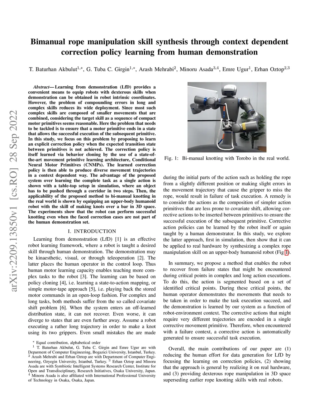 Learning from demonstration (LfD) provides a convenient means to equip robots with dexterous skills when demonstration can be obtained in robot intrinsic coordinates. However, the problem of compounding errors in long and complex skills reduces its wide deployment. Since most such complex skills are composed of smaller movements that are combined, considering the target skill as a sequence of compact motor primitives seems reasonable. Here the problem that needs to be tackled is to ensure that a motor primitive ends in a state that allows the successful execution of the subsequent primitive. In this study, we focus on this problem by proposing to learn an explicit correction policy when the expected transition state between primitives is not achieved. The correction policy is itself learned via behavior cloning by the use of a state-of-the-art movement primitive learning architecture, Conditional Neural Motor Primitives (CNMPs). The learned correction policy is then able to produce diverse movement trajectories in a context dependent way. The advantage of the proposed system over learning the complete task as a single action is shown with a table-top setup in simulation, where an object has to be pushed through a corridor in two steps. Then, the applicability of the proposed method to bi-manual knotting in the real world is shown by equipping an upper-body humanoid robot with the skill of making knots over a bar in 3D space. The experiments show that the robot can perform successful knotting even when the faced correction cases are not part of the human demonstration set.