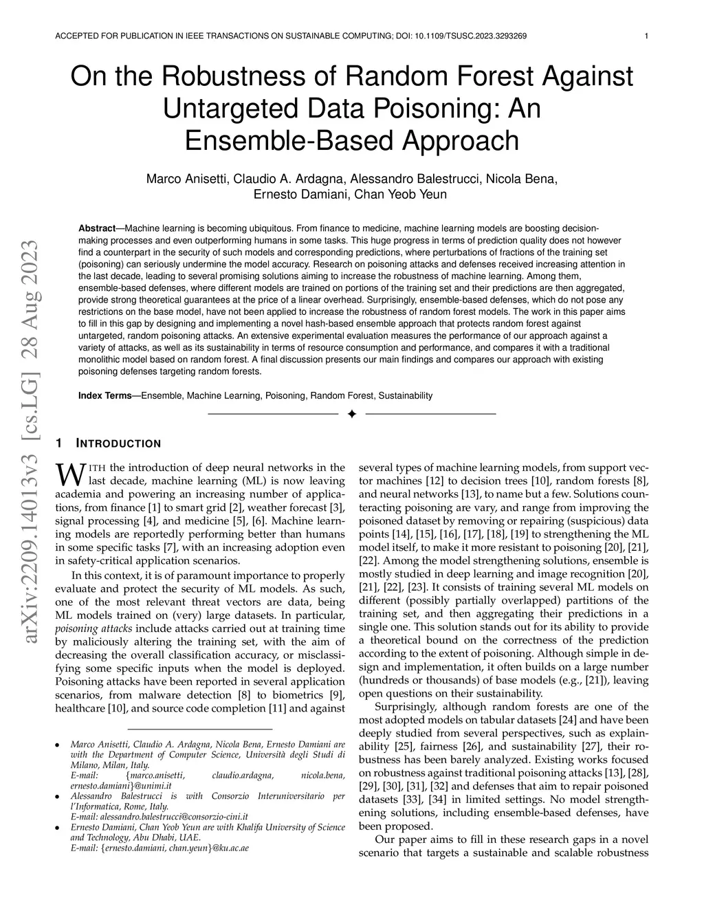 Machine learning is becoming ubiquitous. From finance to medicine, machine learning models are boosting decision-making processes and even outperforming humans in some tasks. This huge progress in terms of prediction quality does not however find a counterpart in the security of such models and corresponding predictions, where perturbations of fractions of the training set (poisoning) can seriously undermine the model accuracy. Research on poisoning attacks and defenses received increasing attention in the last decade, leading to several promising solutions aiming to increase the robustness of machine learning. Among them, ensemble-based defenses, where different models are trained on portions of the training set and their predictions are then aggregated, provide strong theoretical guarantees at the price of a linear overhead. Surprisingly, ensemble-based defenses, which do not pose any restrictions on the base model, have not been applied to increase the robustness of random forest models. The work in this paper aims to fill in this gap by designing and implementing a novel hash-based ensemble approach that protects random forest against untargeted, random poisoning attacks. An extensive experimental evaluation measures the performance of our approach against a variety of attacks, as well as its sustainability in terms of resource consumption and performance, and compares it with a traditional monolithic model based on random forest. A final discussion presents our main findings and compares our approach with existing poisoning defenses targeting random forests.