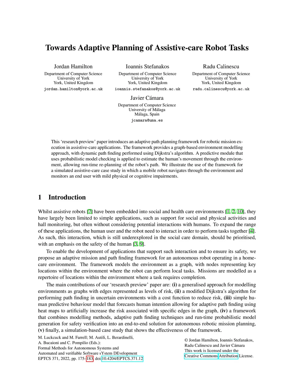 This 'research preview' paper introduces an adaptive path planning framework for robotic mission execution in assistive-care applications. The framework provides a graph-based environment modelling approach, with dynamic path finding performed using Dijkstra's algorithm. A predictive module that uses probabilistic model checking is applied to estimate the human's movement through the environment, allowing run-time re-planning of the robot's path. We illustrate the use of the framework for a simulated assistive-care case study in which a mobile robot navigates through the environment and monitors an end user with mild physical or cognitive impairments.