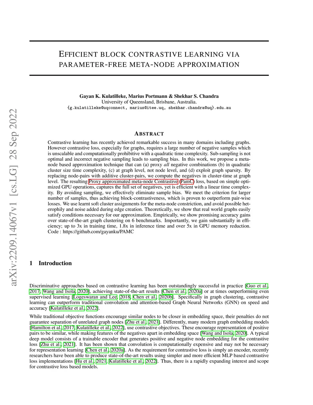 Contrastive learning has recently achieved remarkable success in many domains including graphs. However contrastive loss, especially for graphs, requires a large number of negative samples which is unscalable and computationally prohibitive with a quadratic time complexity. Sub-sampling is not optimal and incorrect negative sampling leads to sampling bias. In this work, we propose a meta-node based approximation technique that can (a) proxy all negative combinations (b) in quadratic cluster size time complexity, (c) at graph level, not node level, and (d) exploit graph sparsity. By replacing node-pairs with additive cluster-pairs, we compute the negatives in cluster-time at graph level. The resulting Proxy approximated meta-node Contrastive (PamC) loss, based on simple optimized GPU operations, captures the full set of negatives, yet is efficient with a linear time complexity. By avoiding sampling, we effectively eliminate sample bias. We meet the criterion for larger number of samples, thus achieving block-contrastiveness, which is proven to outperform pair-wise losses. We use learnt soft cluster assignments for the meta-node constriction, and avoid possible heterophily and noise added during edge creation. Theoretically, we show that real world graphs easily satisfy conditions necessary for our approximation. Empirically, we show promising accuracy gains over state-of-the-art graph clustering on 6 benchmarks. Importantly, we gain substantially in efficiency; up to 3x in training time, 1.8x in inference time and over 5x in GPU memory reduction.