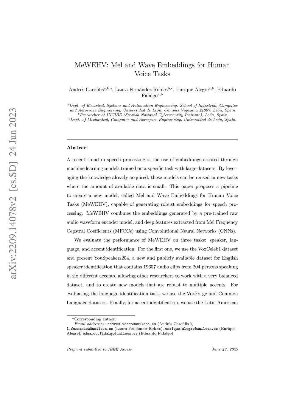 A recent trend in speech processing is the use of embeddings created through machine learning models trained on a specific task with large datasets. By leveraging the knowledge already acquired, these models can be reused in new tasks where the amount of available data is small. This paper proposes a pipeline to create a new model, called Mel and Wave Embeddings for Human Voice Tasks (MeWEHV), capable of generating robust embeddings for speech processing. MeWEHV combines the embeddings generated by a pre-trained raw audio waveform encoder model, and deep features extracted from Mel Frequency Cepstral Coefficients (MFCCs) using Convolutional Neural Networks (CNNs). We evaluate the performance of MeWEHV on three tasks: speaker, language, and accent identification. For the first one, we use the VoxCeleb1 dataset and present YouSpeakers204, a new and publicly available dataset for English speaker identification that contains 19607 audio clips from 204 persons speaking in six different accents, allowing other researchers to work with a very balanced dataset, and to create new models that are robust to multiple accents. For evaluating the language identification task, we use the VoxForge and Common Language datasets. Finally, for accent identification, we use the Latin American Spanish Corpora (LASC) and Common Voice datasets. Our approach allows a significant increase in the performance of state-of-the-art models on all the tested datasets, with a low additional computational cost.