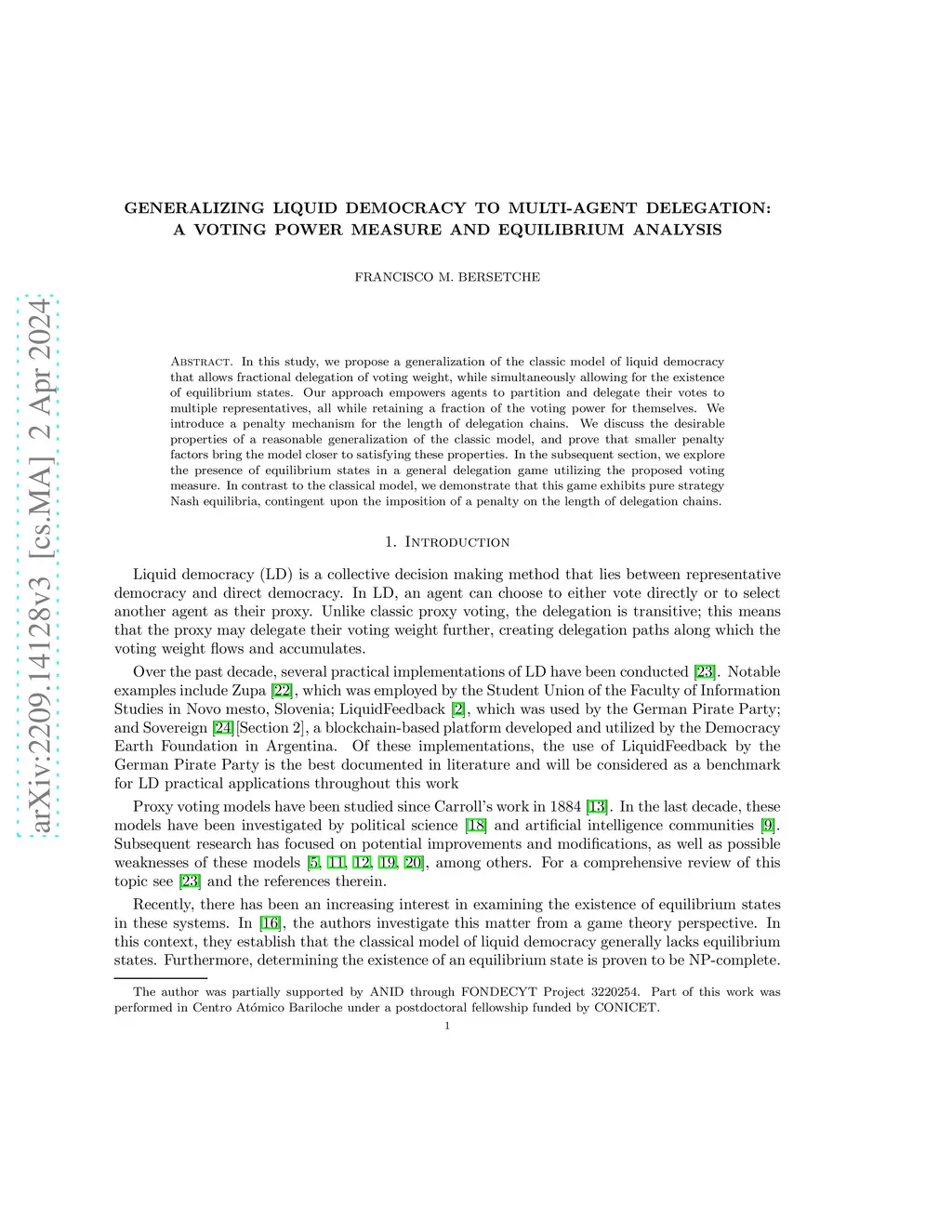 In this study, we propose a generalization of the classic model of liquid democracy that allows fractional delegation of voting weight, while simultaneously allowing for the existence of equilibrium states. Our approach empowers agents to partition and delegate their votes to multiple representatives, all while retaining a fraction of the voting power for themselves. We introduce a penalty mechanism for the length of delegation chains. We discuss the desirable properties of a reasonable generalization of the classic model, and prove that smaller penalty factors bring the model closer to satisfying these properties. In the subsequent section, we explore the presence of equilibrium states in a general delegation game utilizing the proposed voting measure. In contrast to the classical model, we demonstrate that this game exhibits pure strategy Nash equilibria, contingent upon the imposition of a penalty on the length of delegation chains.