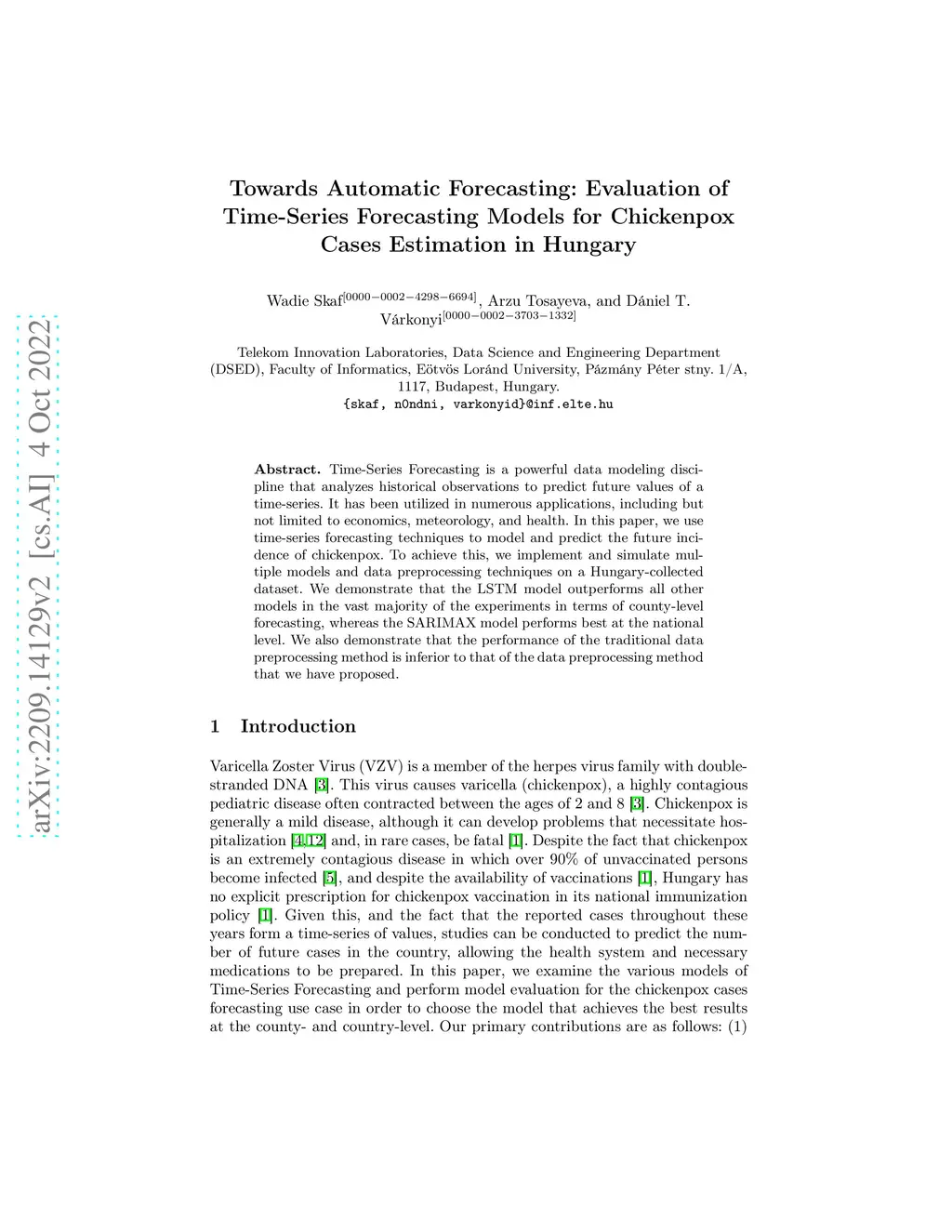 Time-Series Forecasting is a powerful data modeling discipline that analyzes historical observations to predict future values of a time-series. It has been utilized in numerous applications, including but not limited to economics, meteorology, and health. In this paper, we use time-series forecasting techniques to model and predict the future incidence of chickenpox. To achieve this, we implement and simulate multiple models and data preprocessing techniques on a Hungary-collected dataset. We demonstrate that the LSTM model outperforms all other models in the vast majority of the experiments in terms of county-level forecasting, whereas the SARIMAX model performs best at the national level. We also demonstrate that the performance of the traditional data preprocessing method is inferior to that of the data preprocessing method that we have proposed.