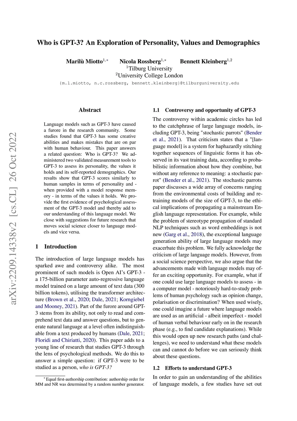 Language models such as GPT-3 have caused a furore in the research community. Some studies found that GPT-3 has some creative abilities and makes mistakes that are on par with human behaviour. This paper answers a related question: Who is GPT-3? We administered two validated measurement tools to GPT-3 to assess its personality, the values it holds and its self-reported demographics. Our results show that GPT-3 scores similarly to human samples in terms of personality and - when provided with a model response memory - in terms of the values it holds. We provide the first evidence of psychological assessment of the GPT-3 model and thereby add to our understanding of this language model. We close with suggestions for future research that moves social science closer to language models and vice versa.