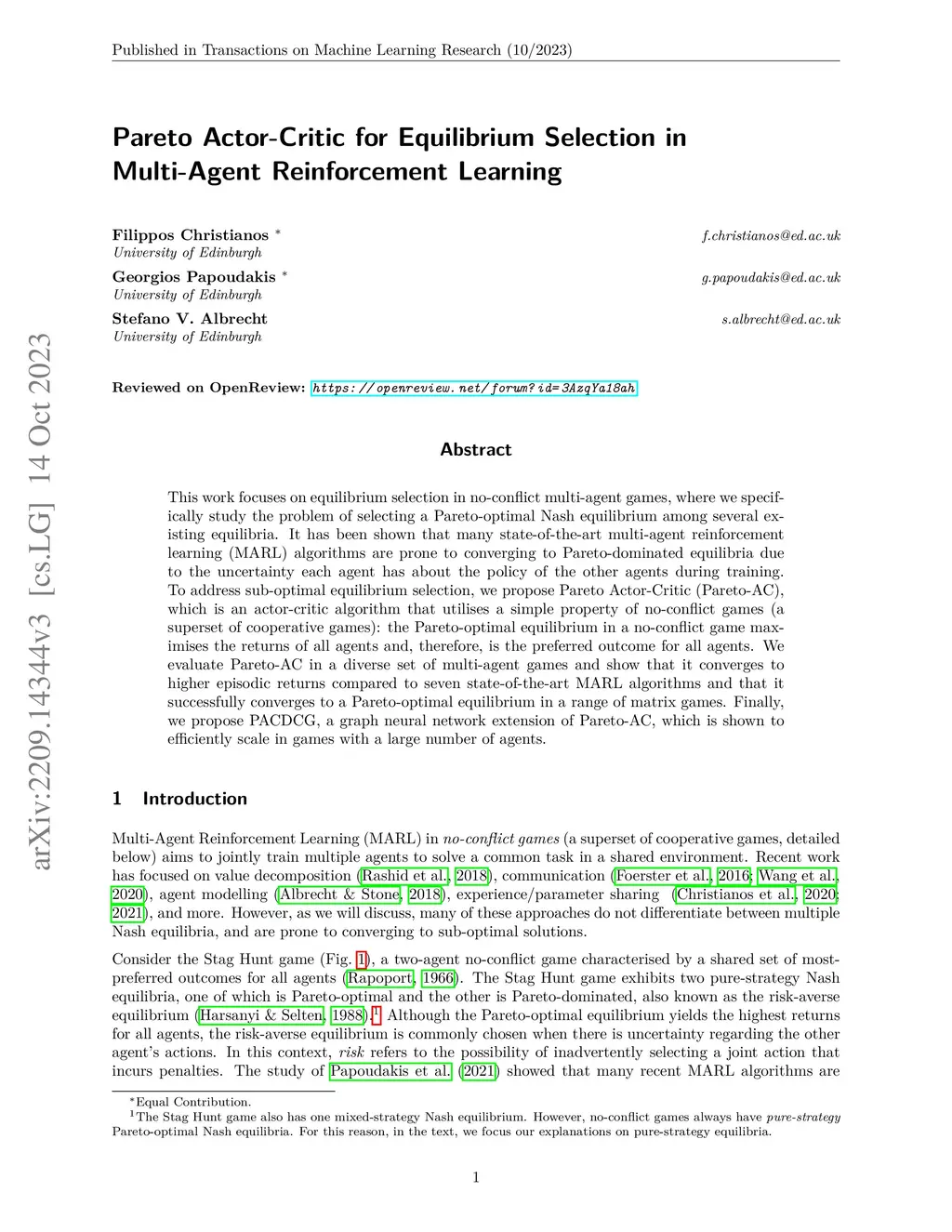 This work focuses on equilibrium selection in no-conflict multi-agent games, where we specifically study the problem of selecting a Pareto-optimal Nash equilibrium among several existing equilibria. It has been shown that many state-of-the-art multi-agent reinforcement learning (MARL) algorithms are prone to converging to Pareto-dominated equilibria due to the uncertainty each agent has about the policy of the other agents during training. To address sub-optimal equilibrium selection, we propose Pareto Actor-Critic (Pareto-AC), which is an actor-critic algorithm that utilises a simple property of no-conflict games (a superset of cooperative games): the Pareto-optimal equilibrium in a no-conflict game maximises the returns of all agents and, therefore, is the preferred outcome for all agents. We evaluate Pareto-AC in a diverse set of multi-agent games and show that it converges to higher episodic returns compared to seven state-of-the-art MARL algorithms and that it successfully converges to a Pareto-optimal equilibrium in a range of matrix games. Finally, we propose PACDCG, a graph neural network extension of Pareto-AC, which is shown to efficiently scale in games with a large number of agents.