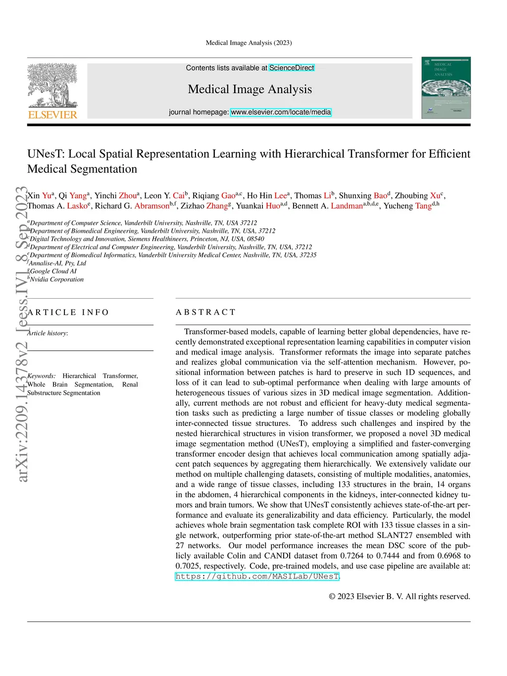 Transformer-based models, capable of learning better global dependencies, have recently demonstrated exceptional representation learning capabilities in computer vision and medical image analysis. Transformer reformats the image into separate patches and realizes global communication via the self-attention mechanism. However, positional information between patches is hard to preserve in such 1D sequences, and loss of it can lead to sub-optimal performance when dealing with large amounts of heterogeneous tissues of various sizes in 3D medical image segmentation. Additionally, current methods are not robust and efficient for heavy-duty medical segmentation tasks such as predicting a large number of tissue classes or modeling globally inter-connected tissue structures. To address such challenges and inspired by the nested hierarchical structures in vision transformer, we proposed a novel 3D medical image segmentation method (UNesT), employing a simplified and faster-converging transformer encoder design that achieves local communication among spatially adjacent patch sequences by aggregating them hierarchically. We extensively validate our method on multiple challenging datasets, consisting of multiple modalities, anatomies, and a wide range of tissue classes, including 133 structures in the brain, 14 organs in the abdomen, 4 hierarchical components in the kidneys, inter-connected kidney tumors and brain tumors. We show that UNesT consistently achieves state-of-the-art performance and evaluate its generalizability and data efficiency. Particularly, the model achieves whole brain segmentation task complete ROI with 133 tissue classes in a single network, outperforming prior state-of-the-art method SLANT27 ensembled with 27 networks.
