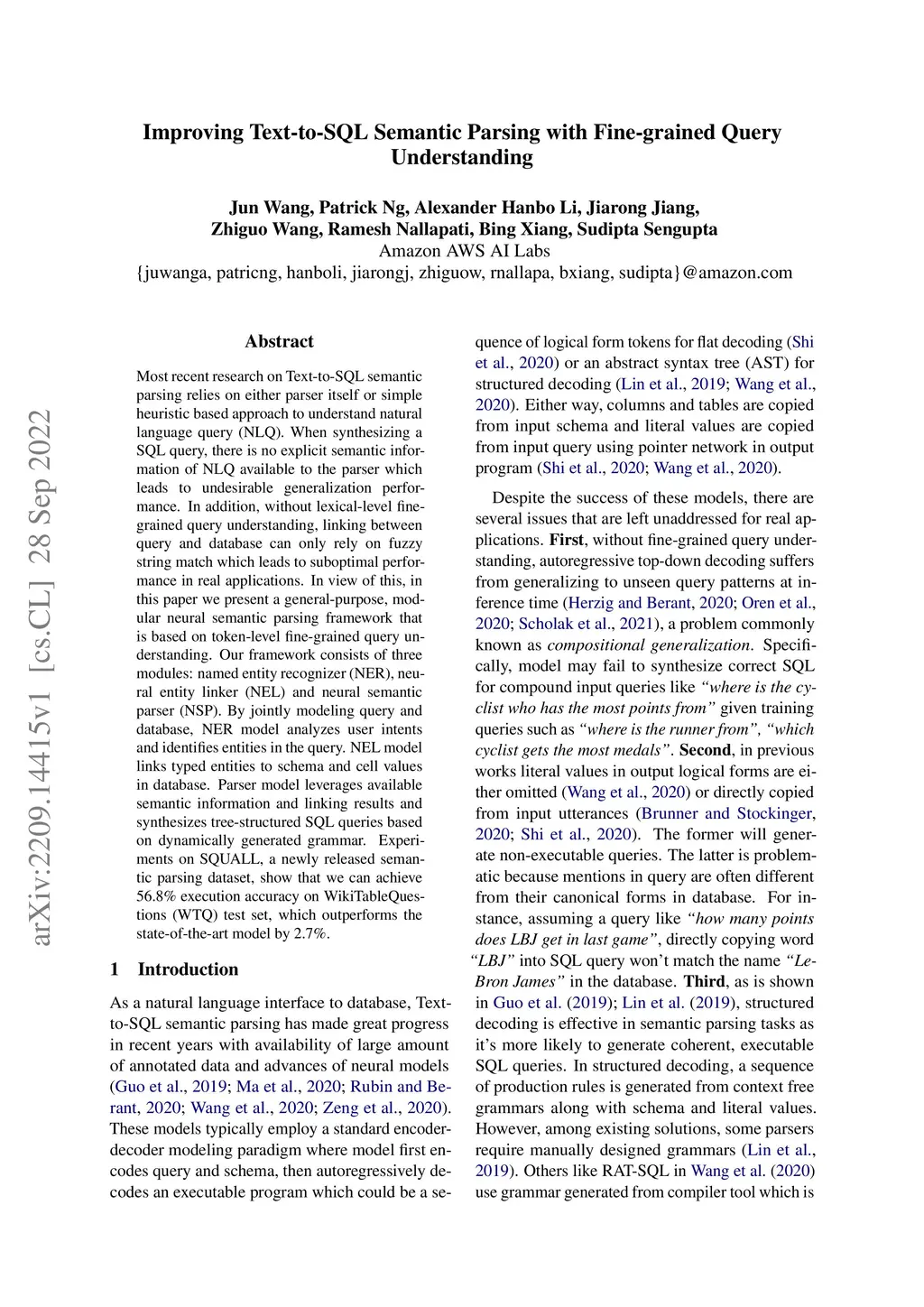 Most recent research on Text-to-SQL semantic parsing relies on either parser itself or simple heuristic based approach to understand natural language query (NLQ). When synthesizing a SQL query, there is no explicit semantic information of NLQ available to the parser which leads to undesirable generalization performance. In addition, without lexical-level fine-grained query understanding, linking between query and database can only rely on fuzzy string match which leads to suboptimal performance in real applications. In view of this, in this paper we present a general-purpose, modular neural semantic parsing framework that is based on token-level fine-grained query understanding. Our framework consists of three modules: named entity recognizer (NER), neural entity linker (NEL) and neural semantic parser (NSP). By jointly modeling query and database, NER model analyzes user intents and identifies entities in the query. NEL model links typed entities to schema and cell values in database. Parser model leverages available semantic information and linking results and synthesizes tree-structured SQL queries based on dynamically generated grammar. Experiments on SQUALL, a newly released semantic parsing dataset, show that we can achieve 56.8% execution accuracy on WikiTableQuestions (WTQ) test set, which outperforms the state-of-the-art model by 2.7%.
