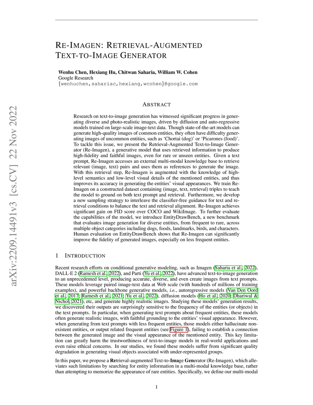 Research on text-to-image generation has witnessed significant progress in generating diverse and photo-realistic images, driven by diffusion and auto-regressive models trained on large-scale image-text data. Though state-of-the-art models can generate high-quality images of common entities, they often have difficulty generating images of uncommon entities, such as `Chortai (dog)' or `Picarones (food)'. To tackle this issue, we present the Retrieval-Augmented Text-to-Image Generator (Re-Imagen), a generative model that uses retrieved information to produce high-fidelity and faithful images, even for rare or unseen entities. Given a text prompt, Re-Imagen accesses an external multi-modal knowledge base to retrieve relevant (image, text) pairs and uses them as references to generate the image. With this retrieval step, Re-Imagen is augmented with the knowledge of high-level semantics and low-level visual details of the mentioned entities, and thus improves its accuracy in generating the entities' visual appearances. We train Re-Imagen on a constructed dataset containing (image, text, retrieval) triples to teach the model to ground on both text prompt and retrieval. Furthermore, we develop a new sampling strategy to interleave the classifier-free guidance for text and retrieval conditions to balance the text and retrieval alignment. Re-Imagen achieves significant gain on FID score over COCO and WikiImage. To further evaluate the capabilities of the model, we introduce EntityDrawBench, a new benchmark that evaluates image generation for diverse entities, from frequent to rare, across multiple object categories including dogs, foods, landmarks, birds, and characters. Human evaluation on EntityDrawBench shows that Re-Imagen can significantly improve the fidelity of generated images, especially on less frequent entities.