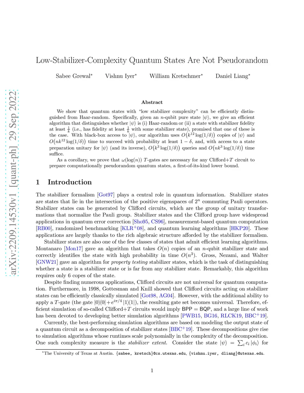 We show that quantum states with "low stabilizer complexity" can be efficiently distinguished from Haar-random. Specifically, given an -qubit pure state , we give an efficient algorithm that distinguishes whether is (i) Haar-random or (ii) a state with stabilizer fidelity at least (i.e., has fidelity at least with some stabilizer state), promised that one of these is the case. With black-box access to , our algorithm uses copies of and time to succeed with probability at least , and, with access to a state preparation unitary for (and its inverse), queries and time suffice. As a corollary, we prove that -gates are necessary for any Clifford+ circuit to prepare computationally pseudorandom quantum states, a first-of-its-kind lower bound.